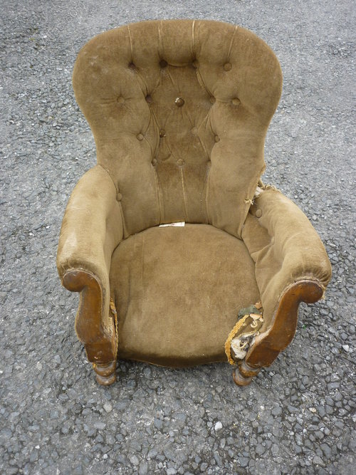 This chair is waiting to be restored, smashed frame, need new pegs as the old ones have been broken. polished facings in to a small turned leg. button back.