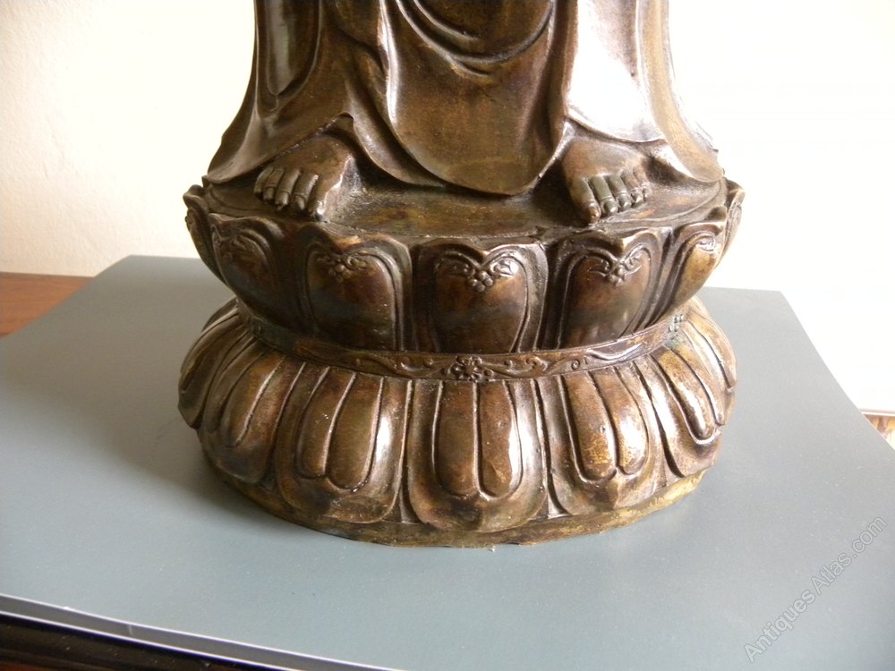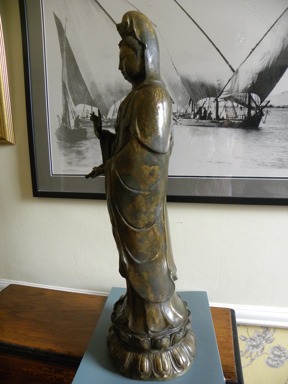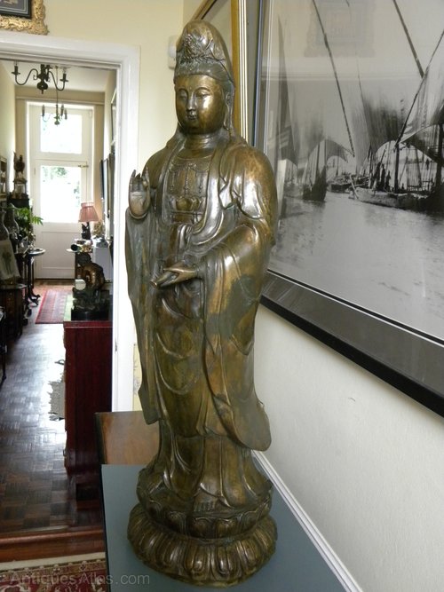 An imposing bronze figure of Guanyin dressed in tradional robes ans standing on a lotus flower "Guanyin is an oriental goddess of mercy and worshiped by the Buddhist faith. In excellent condition. Thought to be late 19th early 20th century. The weight is 18 kilogrames.