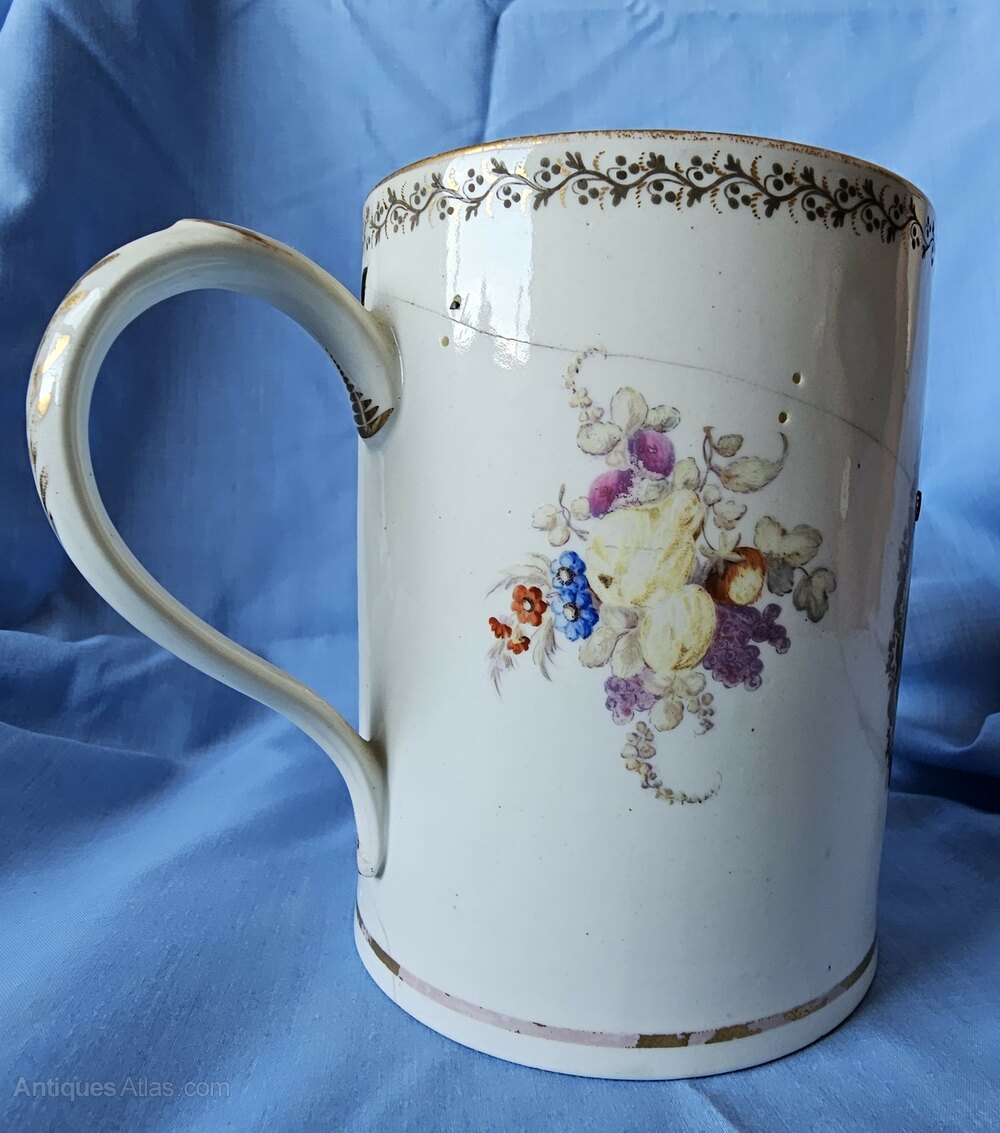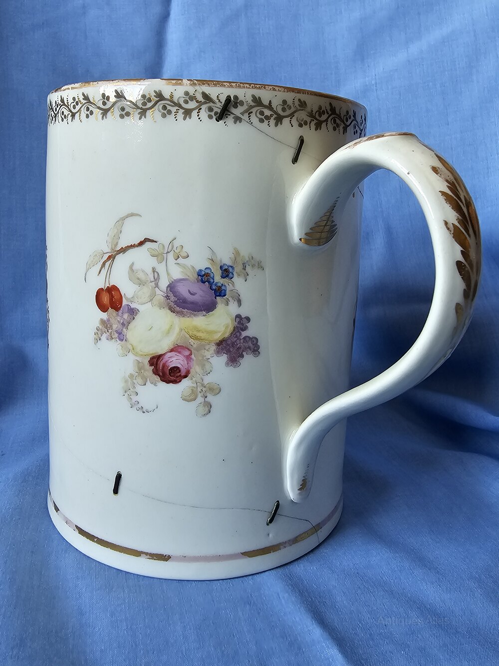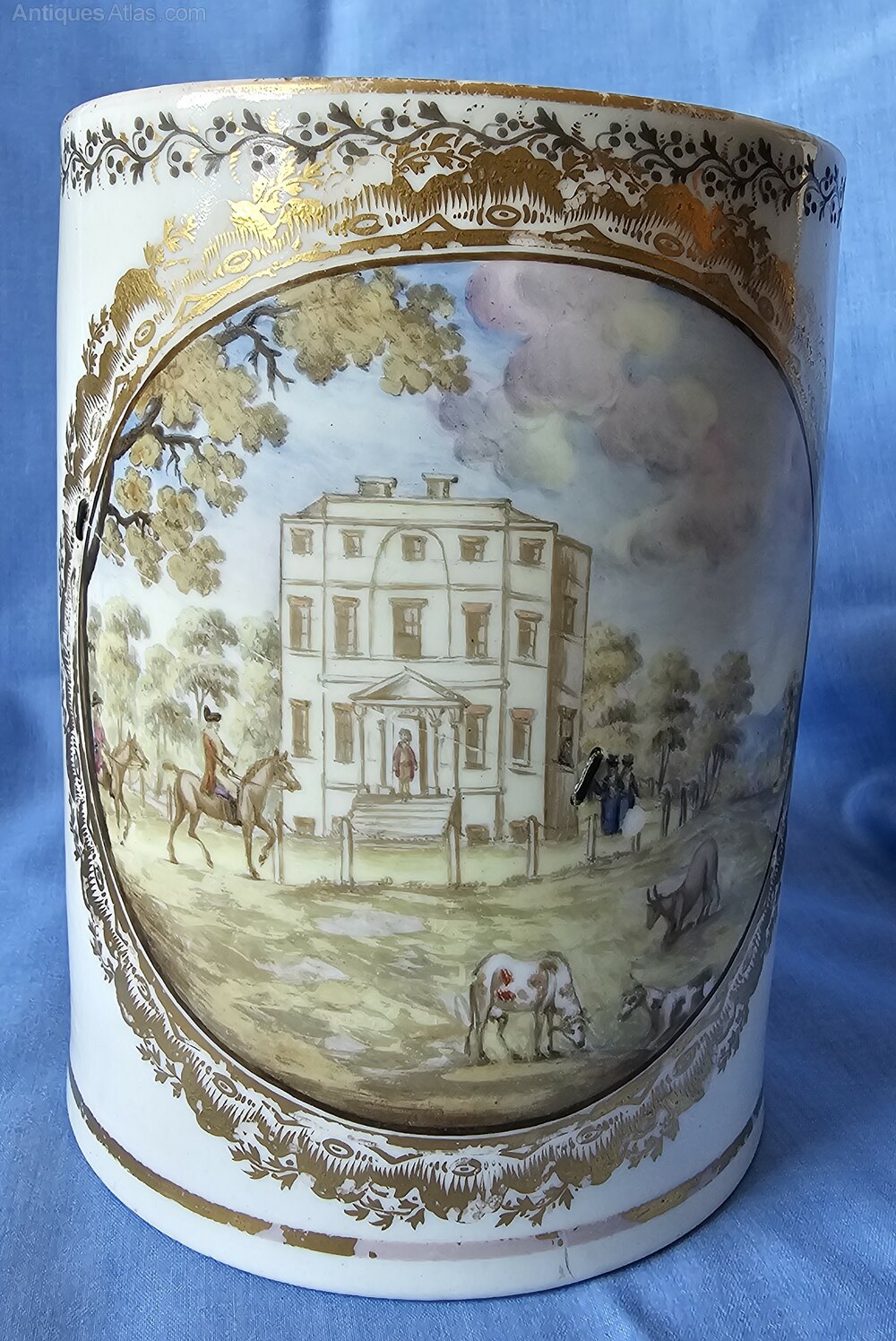 A fine quality Caughley tankard C1790 painted with a country house with animals and figures and figures in the foreground