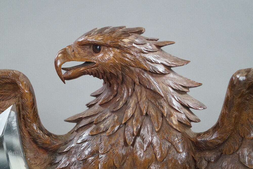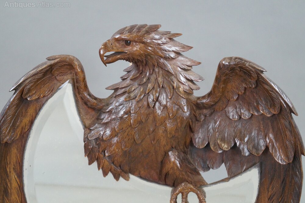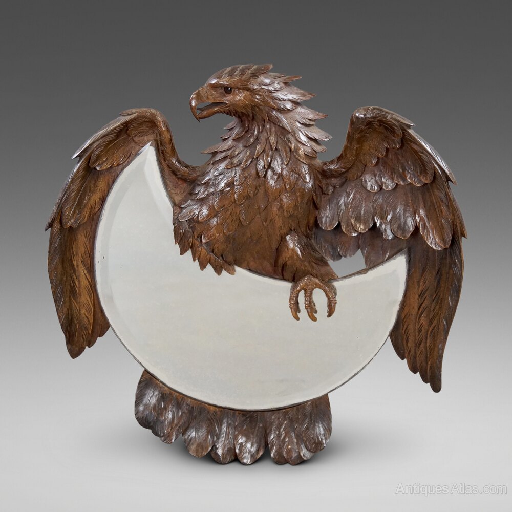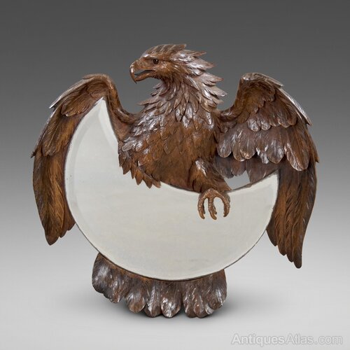A Black Forest mirror. Beautifully carved, in linden wood, in the form of a spread eagle and with its original crescent moon mirror with beveled edge. In excellent condition. 330mm high, 320mm wide and 40mm deep. German. Circa 1890.