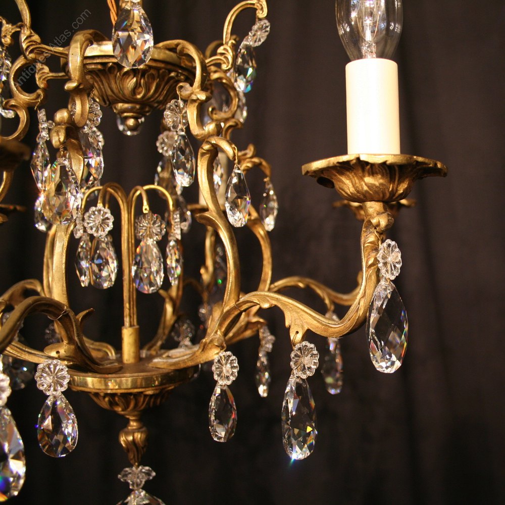 An ornate French gilded cast brass and Swarovski crystal 6 light birdcage form chandelier, the reeded scrolling arms with circular leaf bobeche drip pans, issuing from a central cage form interior with an Acanthus leaf canopy, decorated overall with faceted Swarovski crystal cut glass pendants, with original chain and ceiling rose, original patination and nice crisp casting. Fully rewired and PAT tested. All our chandeliers come with bulbs and ceiling fixings.