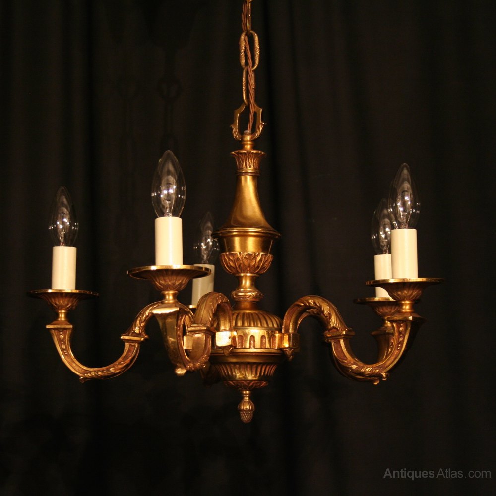 A lovely small French gilded cast bronze 5 light antique chandelier, the ornately cast Acanthus leaf scrolling arms with reeded circular bobeche drip pans, issuing from a bulbous leaf foliated central column with original chain and ceiling rose, excellent original crisp gilding and lovely small size. Fully rewired and PAT tested. All our chandeliers come with bulbs and ceiling fixings.