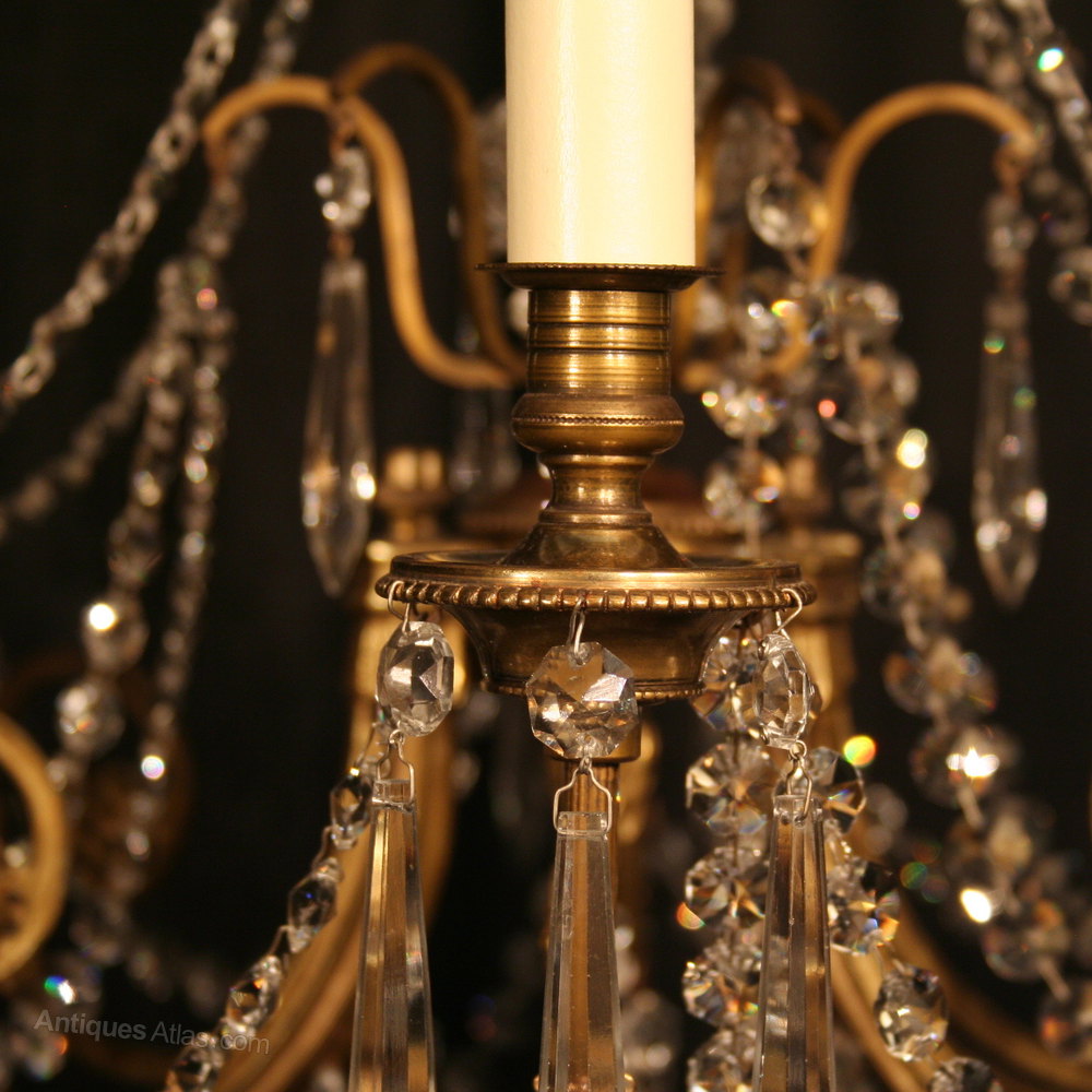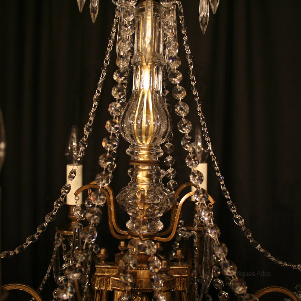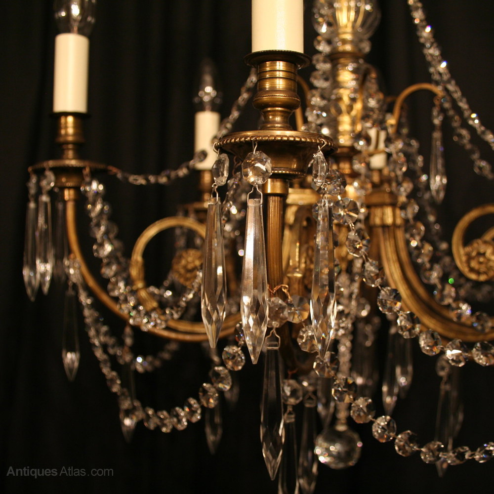A French bronze and crystal 6 light antique chandelier, the reeded scrolling arms with millgrain drip pans and cast candle sconces, issuing from a glass baluster central interior column with a scrolling top canopy, decorated overall in faceted crystal swag cut glass pendants with interlinking arm swag crystal and also French icicle crystal pendants, having the original chain and ceiling rose, excellent patination and size. Fully rewired and PAT tested. All our chandeliers come with ceiling fixings and spare bulbs.