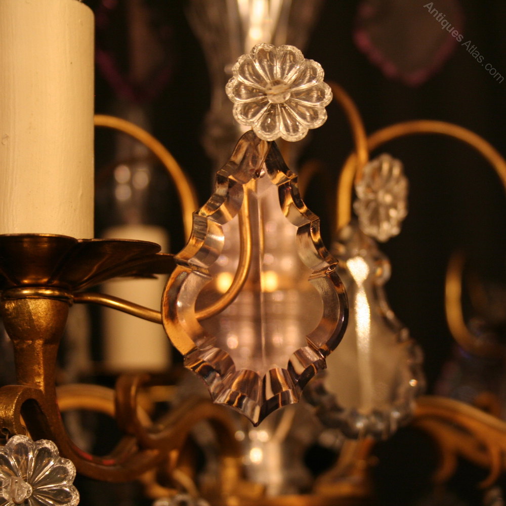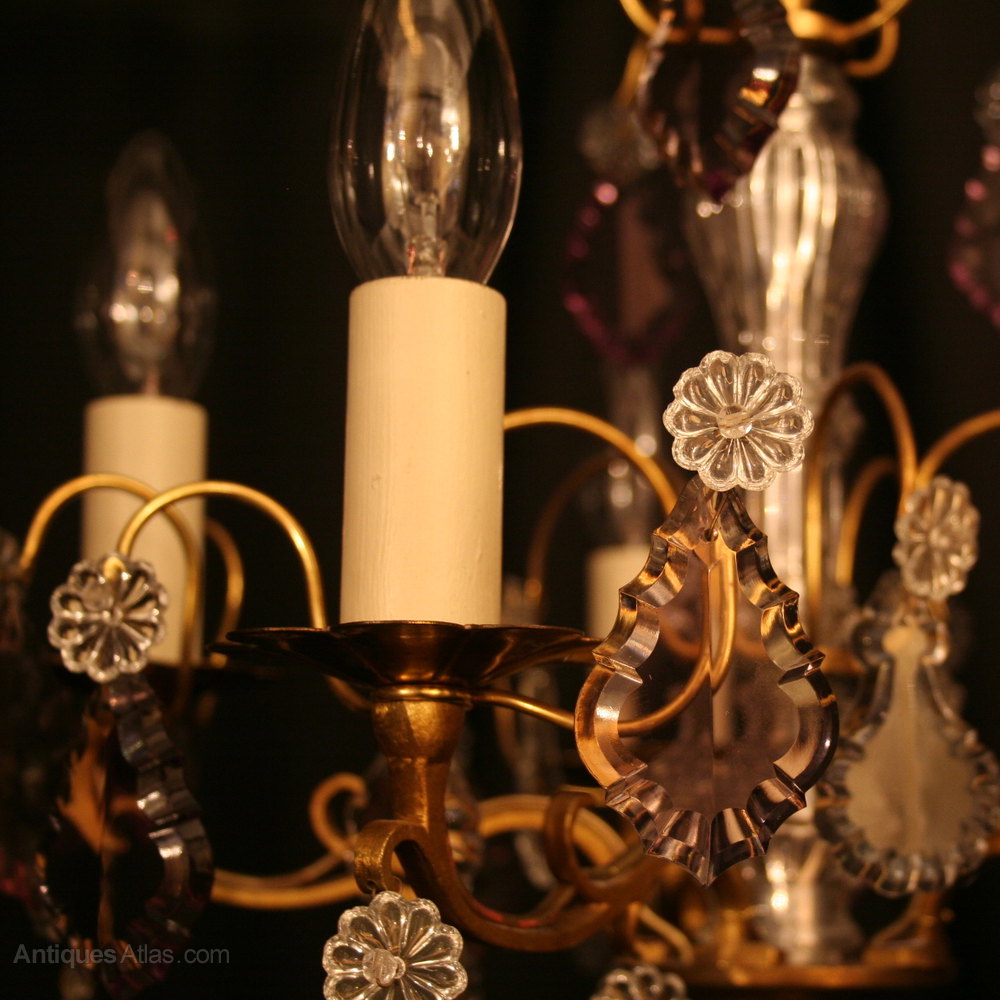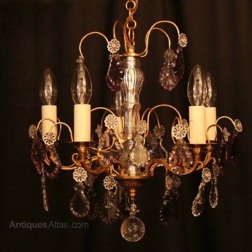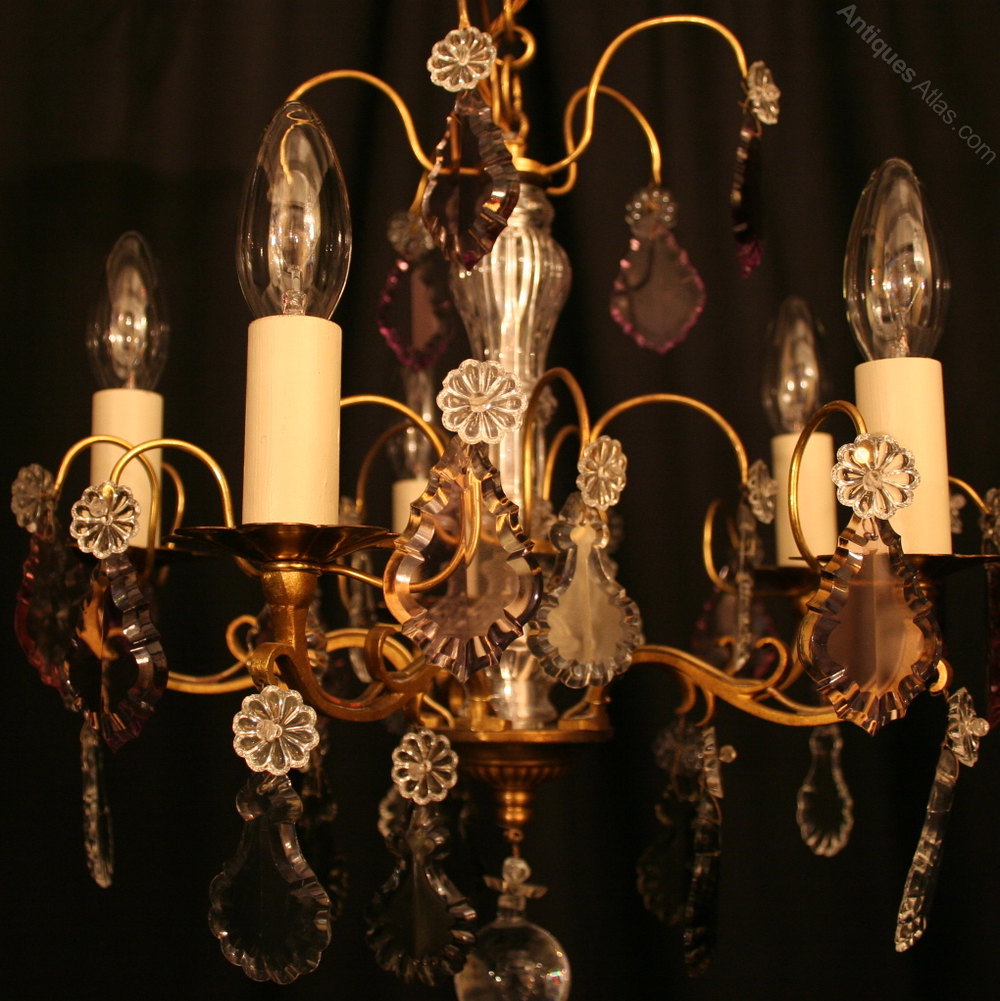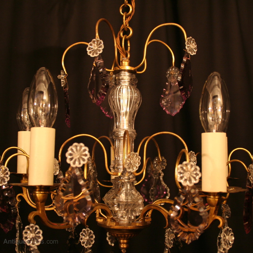 A pretty French gilded cast brass and cut glass 5 light antique chandelier, the square gauge scrolling arms with cast floral drip pans, issuing from a reeded sectional glass baluster central column and scrolling wire work canopy, decorated overall with French clear and Amethyst Slab cut glass crystal faceted pendants, lovely size and colour. Fully rewired and PAT tested. All our chandeliers come with bulbs and ceiling fixings.