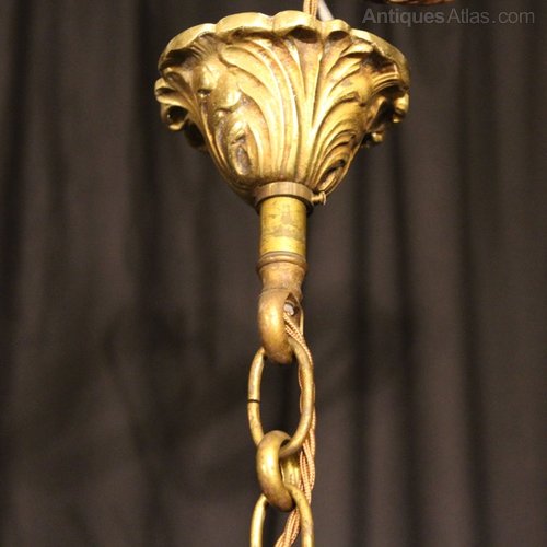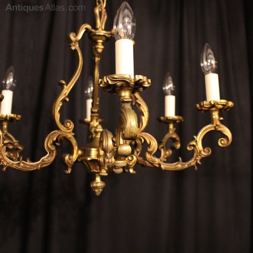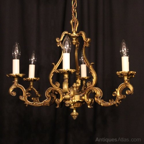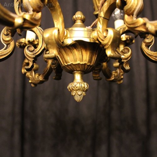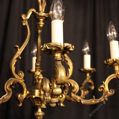 A French gilded cast brass 6 light cage form antique chandelier, the ornate leaf scrolling arms with leaf cast circular bobeche drip pans, issuing from a foliated triple arm cage form interior, having the original ornate chain and ceiling rose, great faded gilded patination and nicely cast. Fully rewired and PAT tested. All our chandeliers come with bulbs and ceiling fixings.