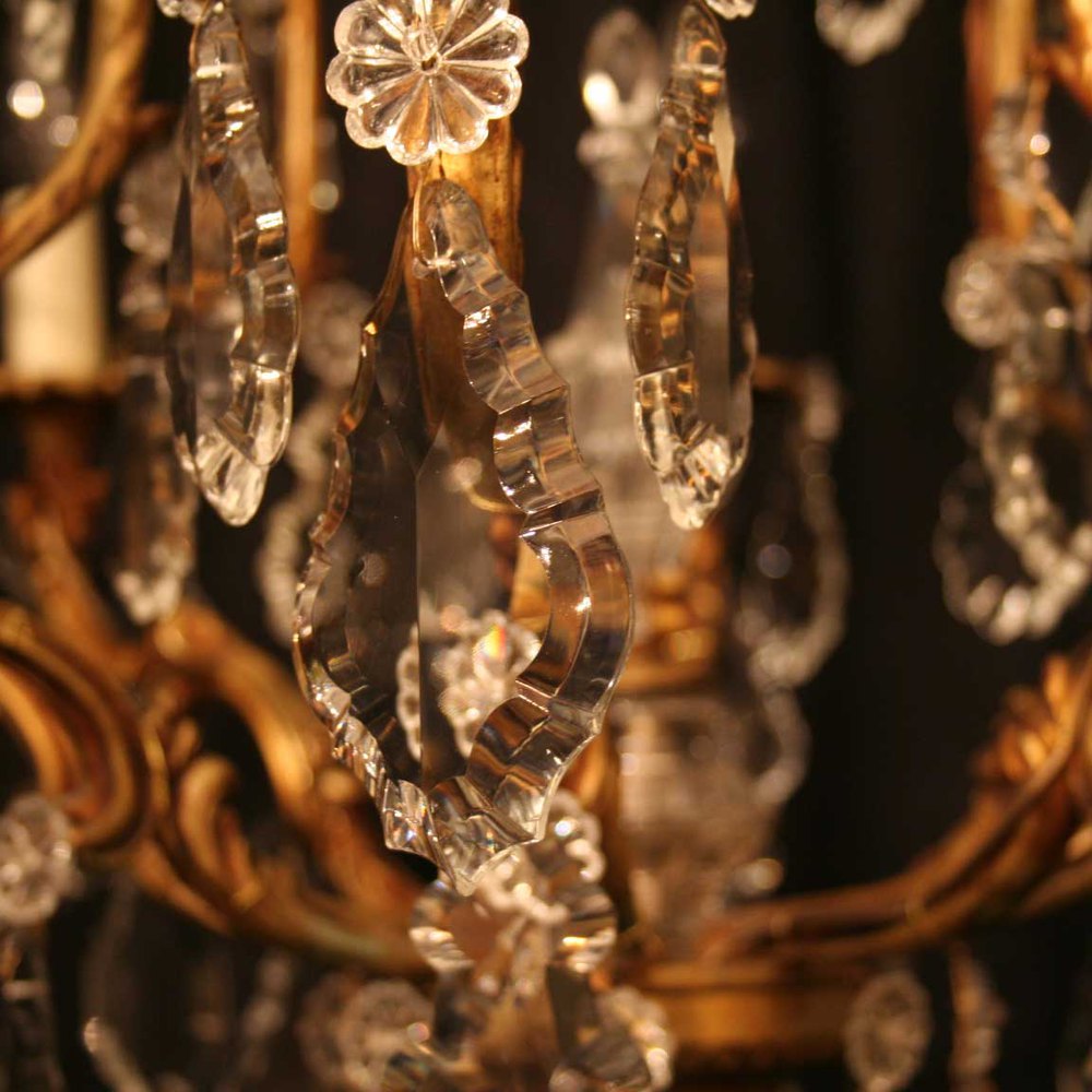 A quality pair French gilded cast brass and cut glass 8 light cage form chandeliers, the Acanthus leaf scrolling arms with cast drip pans issuing from a cage form interior with a large prismatic spike and having a scrolling top canopy, decorated overall in large French Slab faceted crystal cut glass pendants with the original chain and ceiling roses, excellent patination. Fully rewired and PAT tested. All our chandeliers come with ceiling fixings and spare bulbs.