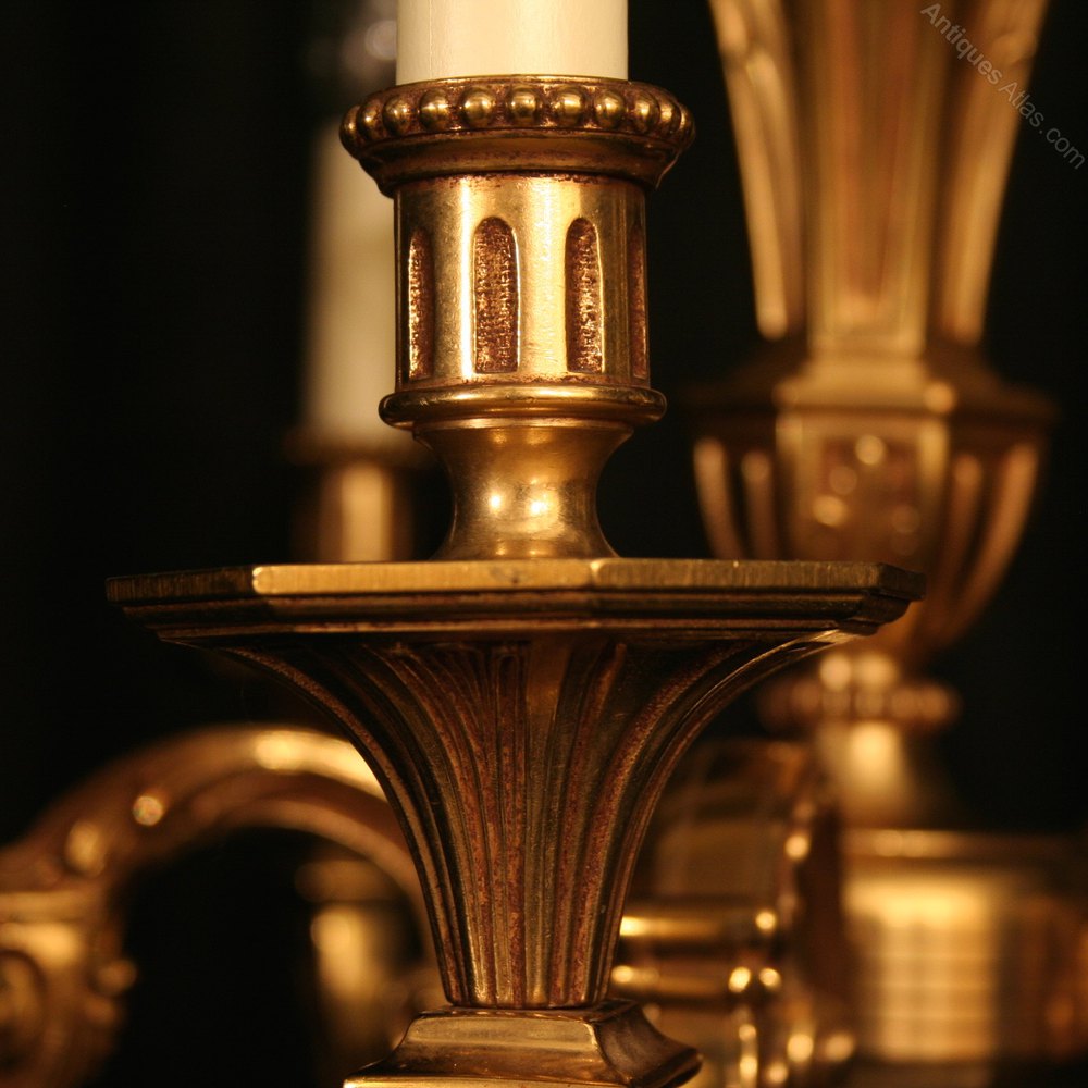 A French pair of gilded cast brass 6 light chandeliers, the square cut scrolling arms with hexagonal trumpet tapering cast drip pans and reeded millgrain candle sconces, issuing from a tapering hexagonal foliated central column with super original chain and ceiling rose, good clean bright patination. Fully rewired and PAT tested. All our chandeliers come with bulbs and ceiling fixings.