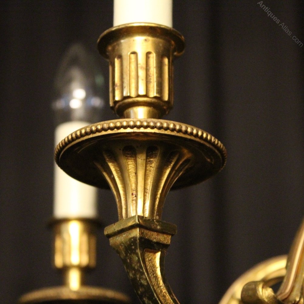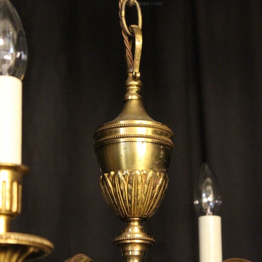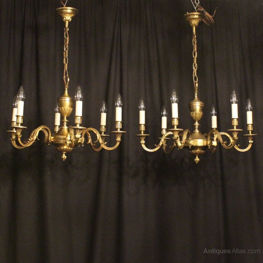 A French pair of gilded cast brass 6 light chandeliers, the ornately cast scrolling arms with circular trumpet reeded millgrain cast bobeche drip pans and reeded candle sconces, issuing from a baluster central column with leaf embellishments and having the original chain and ceiling rose, original gilded patination and good size. Fully rewired and PAT tested. All our chandeliers come with bulbs and ceiling fixings.