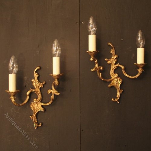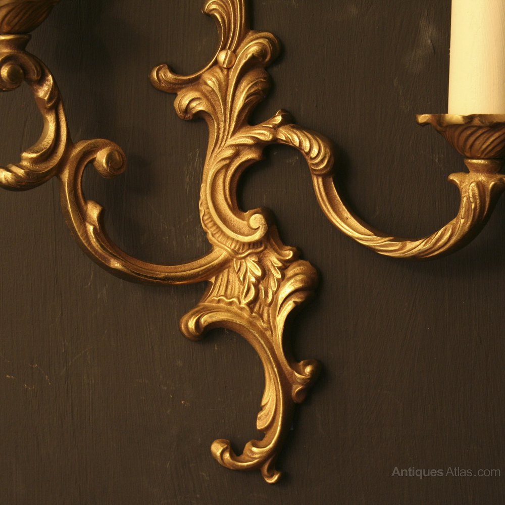 A French pair of rococo opposing gilded cast brass twin arm antique wall lights, the scrolling arms with cast drip pans issuing from an 'S' scrolling backplate, a pretty pair of nice proportions and patination. Fully rewired and PAT tested. All our wall lights come with aged brass screws for fixing and spare bulbs.