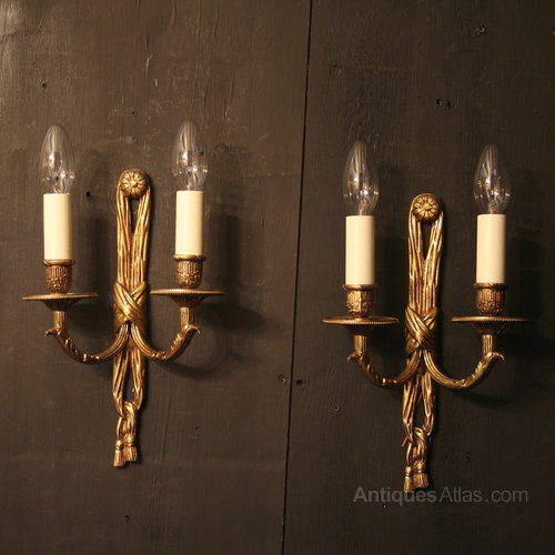 A French pair of gilded cast brass twin arm antique wall lights, the reeded leaf scrolling arms with floral and mill grain drip pans and reeded candle sconces, issuing from a decoratively cast elongated rope and tassel pierced backplate, nice original patination. Fully rewired and PAT tested. All our wall lights come with aged brass screws for fixing and spare bulbs.