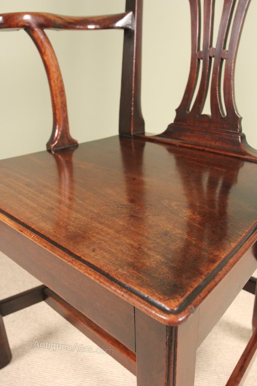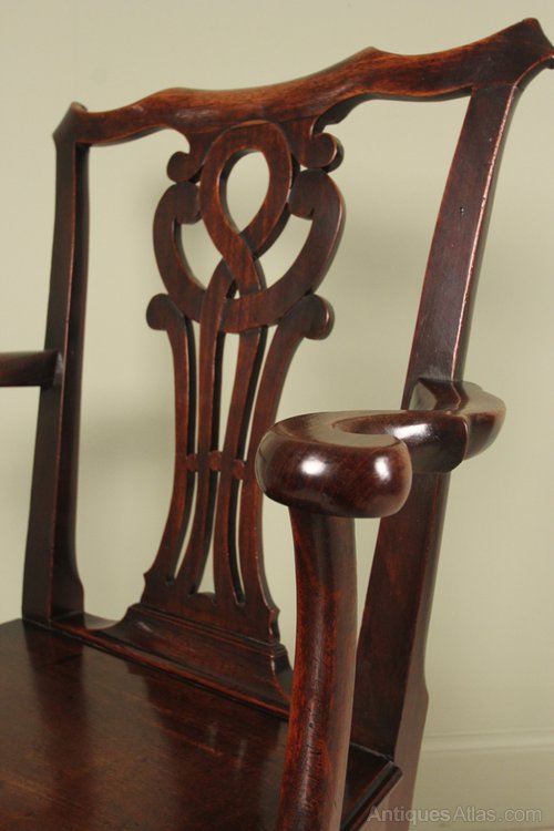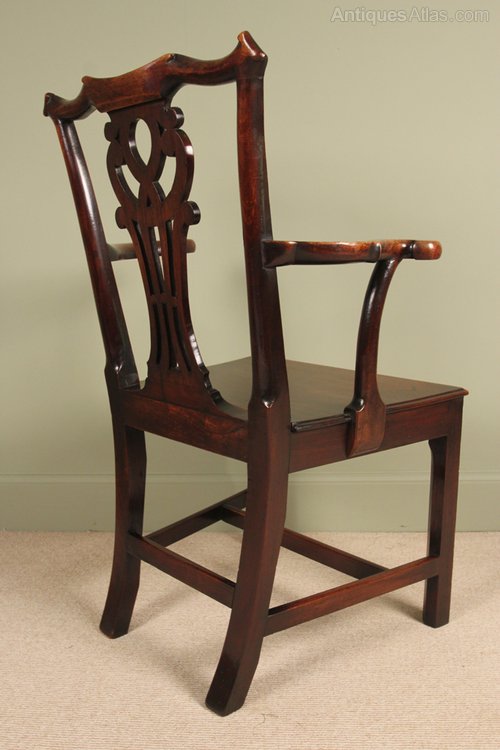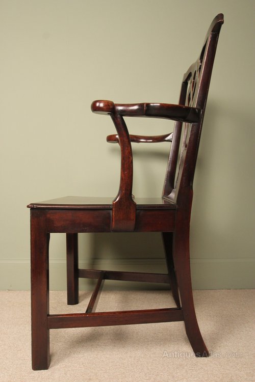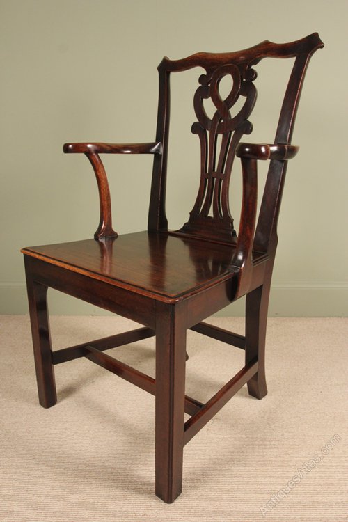 A superb 18th century Mahogany Elbow Chair in wonderful original condition throughout with fantastic colour. Having a pierced splat with solid seat and scrolled arms, raised on chamfered legs joined by stretcher rails. English, George II.