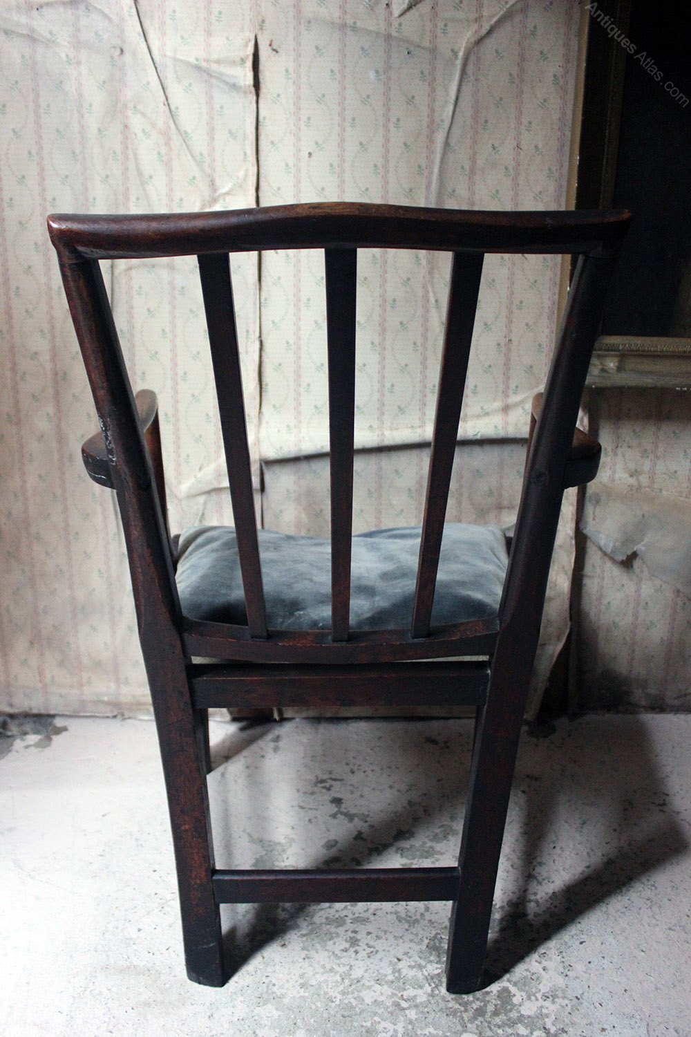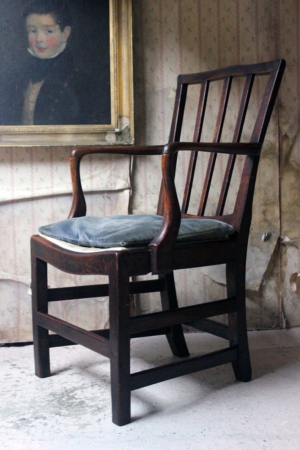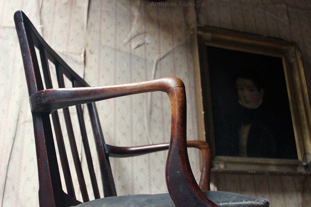 The good quality country house open elbow chair with a well patinated oak carcass, the shaped spindle splat back with beautifully swept serpentine arms above a silk striped drop in seat with powder blue velvet squab, on square chamfered legs united by an h-stretcher, the whole surviving from George III period England.