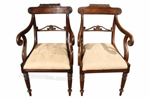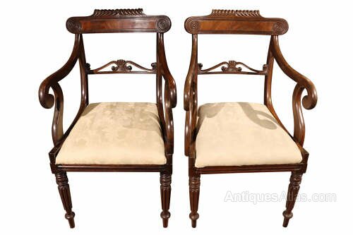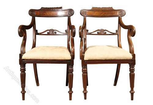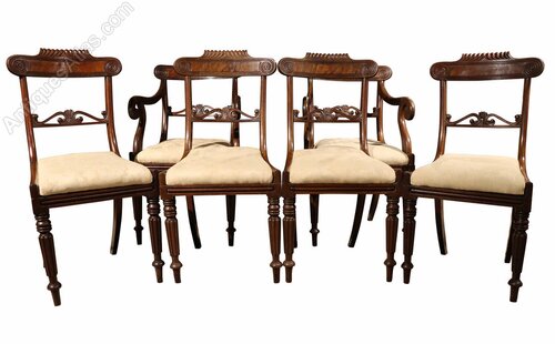 A Good Set of Six Mahogany Dining Chairs in the Manner of Gillows, Circa 1830 comprising four side chairs and two armchairs, each with bar backs carved with scrolling detail above a pierced central splat. The drop-in seats are upholstered in a light damask fabric, supported on turned and fluted forelegs with outswept rear supports. The armchairs with elegant scrolled arms. A fine and well-balanced set of early 19th century dining chairs, displaying the refined design associated with Gillows of Lancaster.
