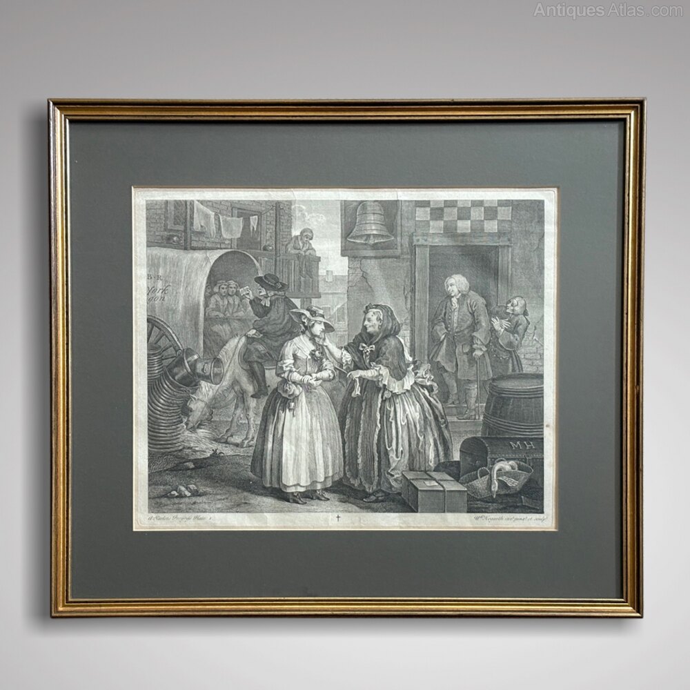 Plate 1 in the set of engravings depicts the arrival in London of the young Moll Hackabout. The prints were first published in 1732. This very early impression is in good condition, there is minor discolouration around the edge but this is to be expected in an item at least 200 years old. Provenance, a private collection of important early English prints and engravings.