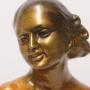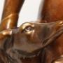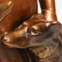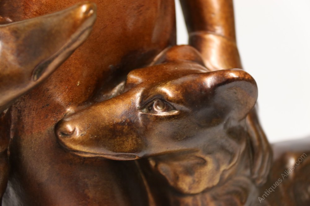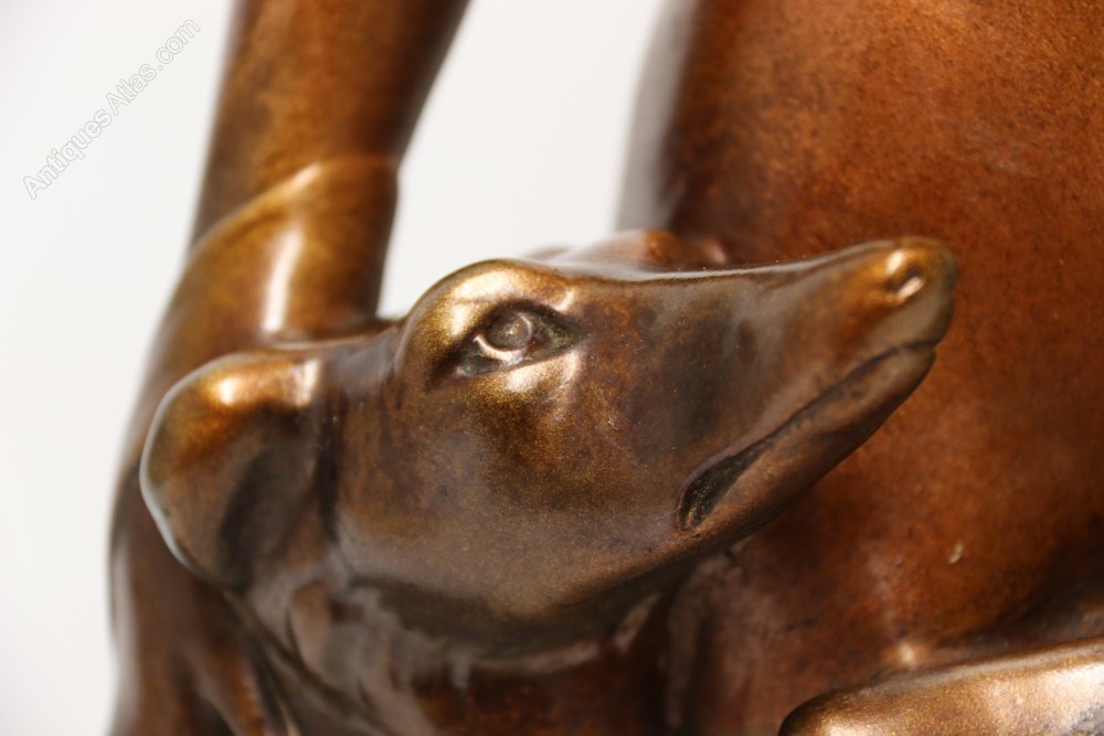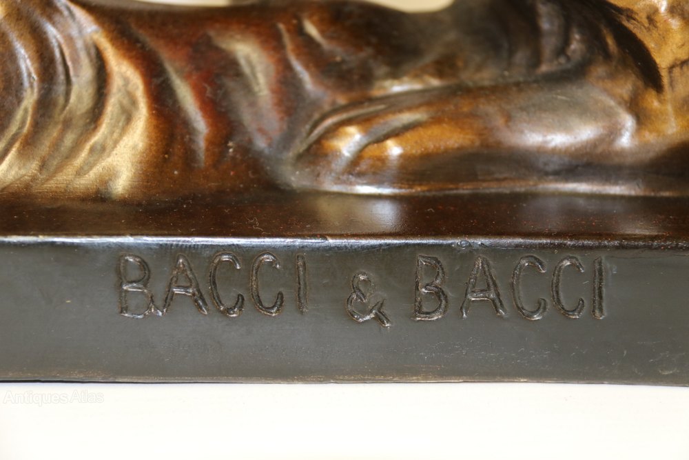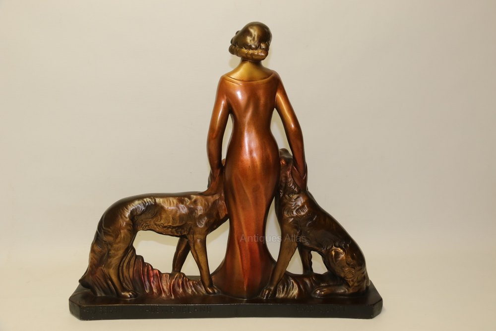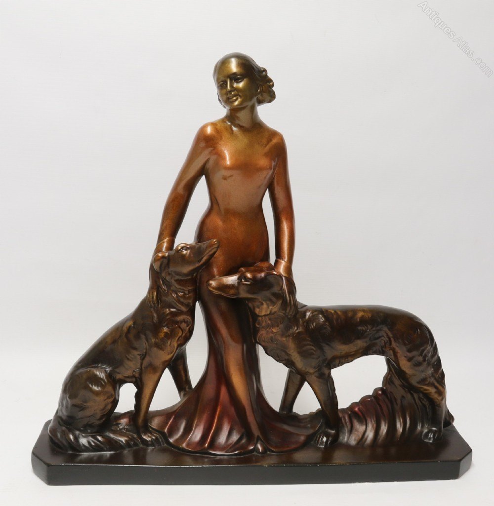 This large and highly decorative 1930s figure group depicts a beautiful young woman dressed in an evening gown standing elegantly with her two Russian Borzoi dogs. It is made from plaster and cold painted in various metallic bronze tones. It is signed on the reverse, Bacci and Bacci, made in England, RD 836911, and is in good condition with age related patination to the painted surfaces.