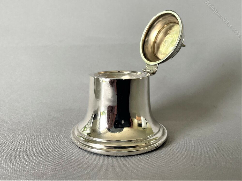 A charming and small, early George V novelty silver 'Bell' Inkwell. This attractive example has a weighted base for stability and a hinged lid, with an Art Deco style thumb grip. Inside is a removable glass inkwell liner. A delightful piece, both decorative and usable.