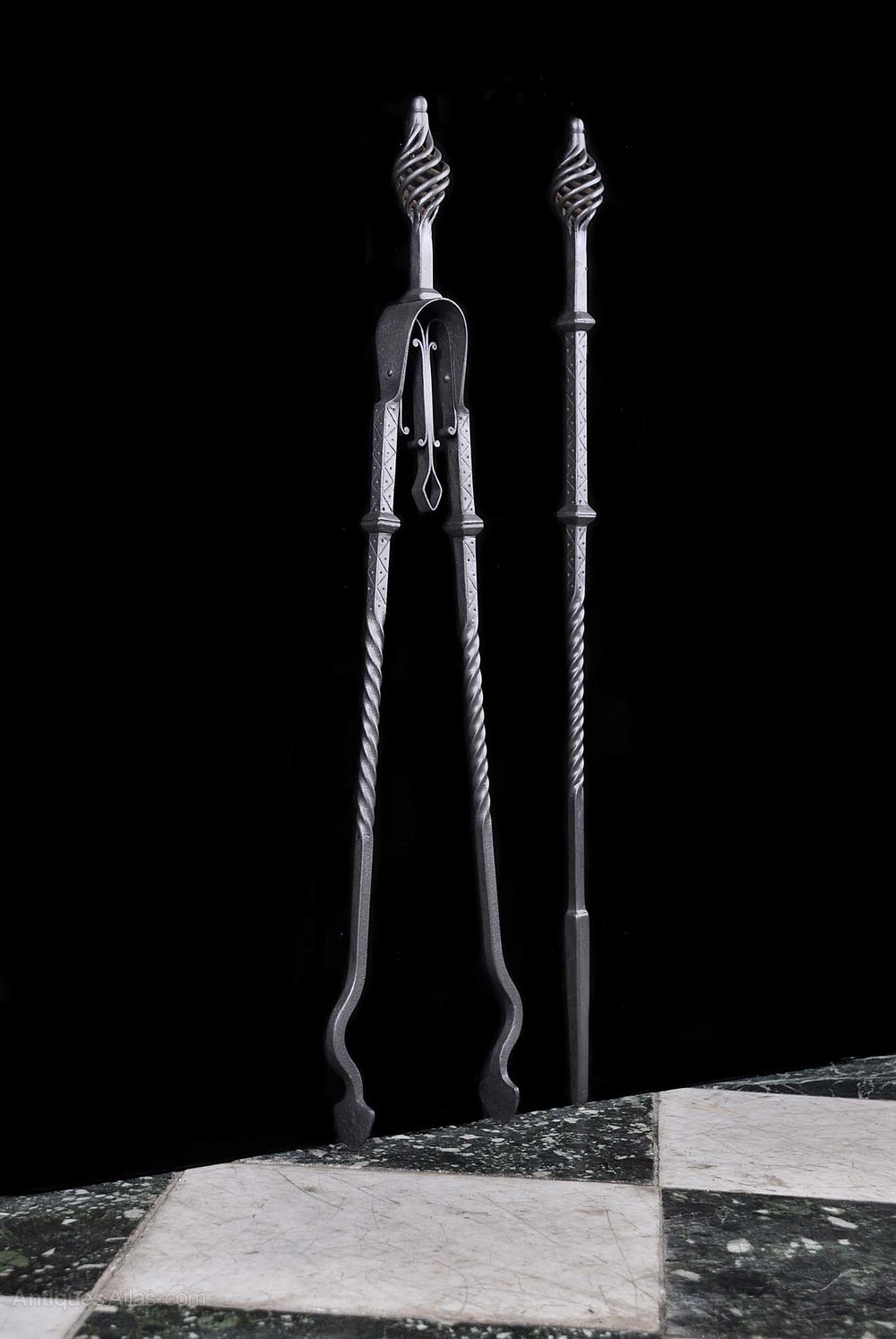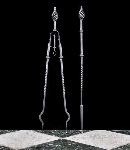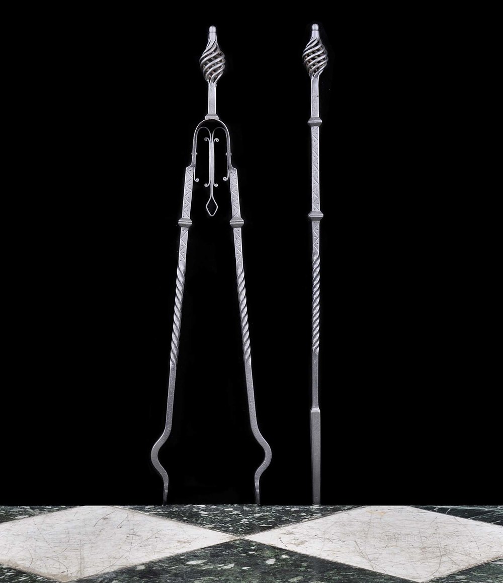 A pair of Arts & Crafts fire tools, a poker and a pair of tongs, with wrythen finials and barley twist stems. English, early 20th century