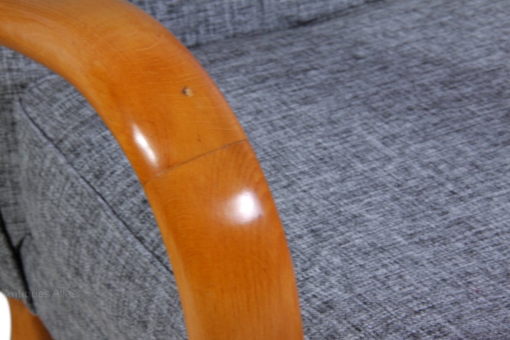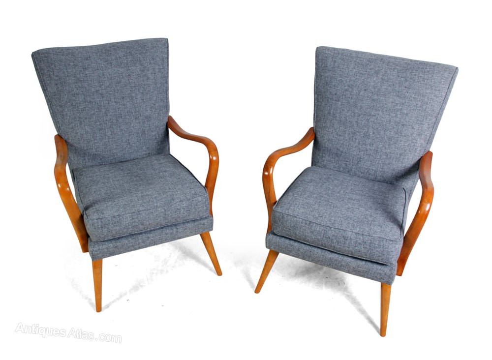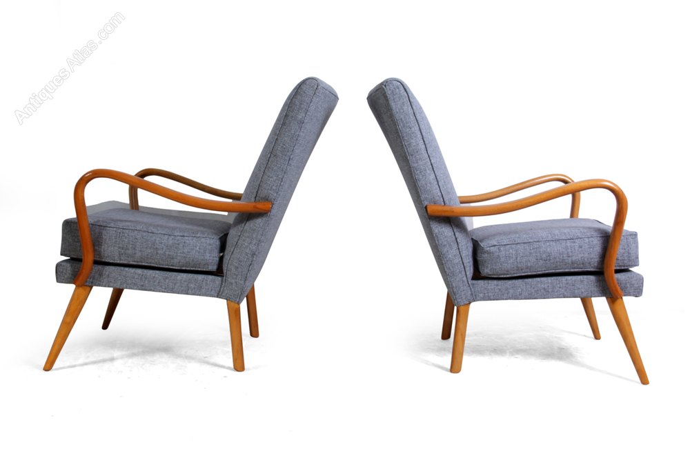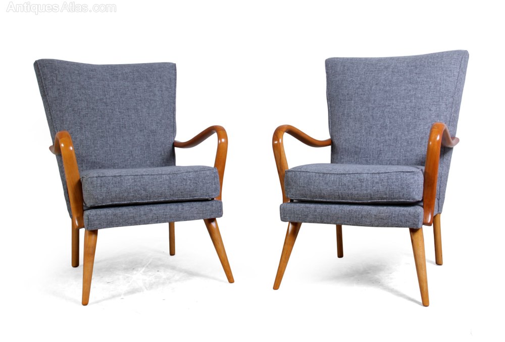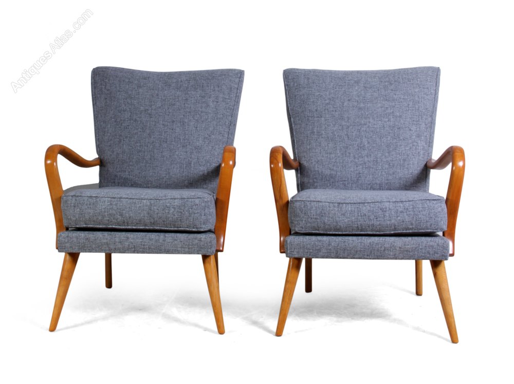A pair of newly upholstered, Mid Century Bambino chairs designed by Howard Keith and produced in his factories in the late 1940's early 50's. Constructed of solid beech and upholstered in grey woven heavy fabric and in lovely condition throughout