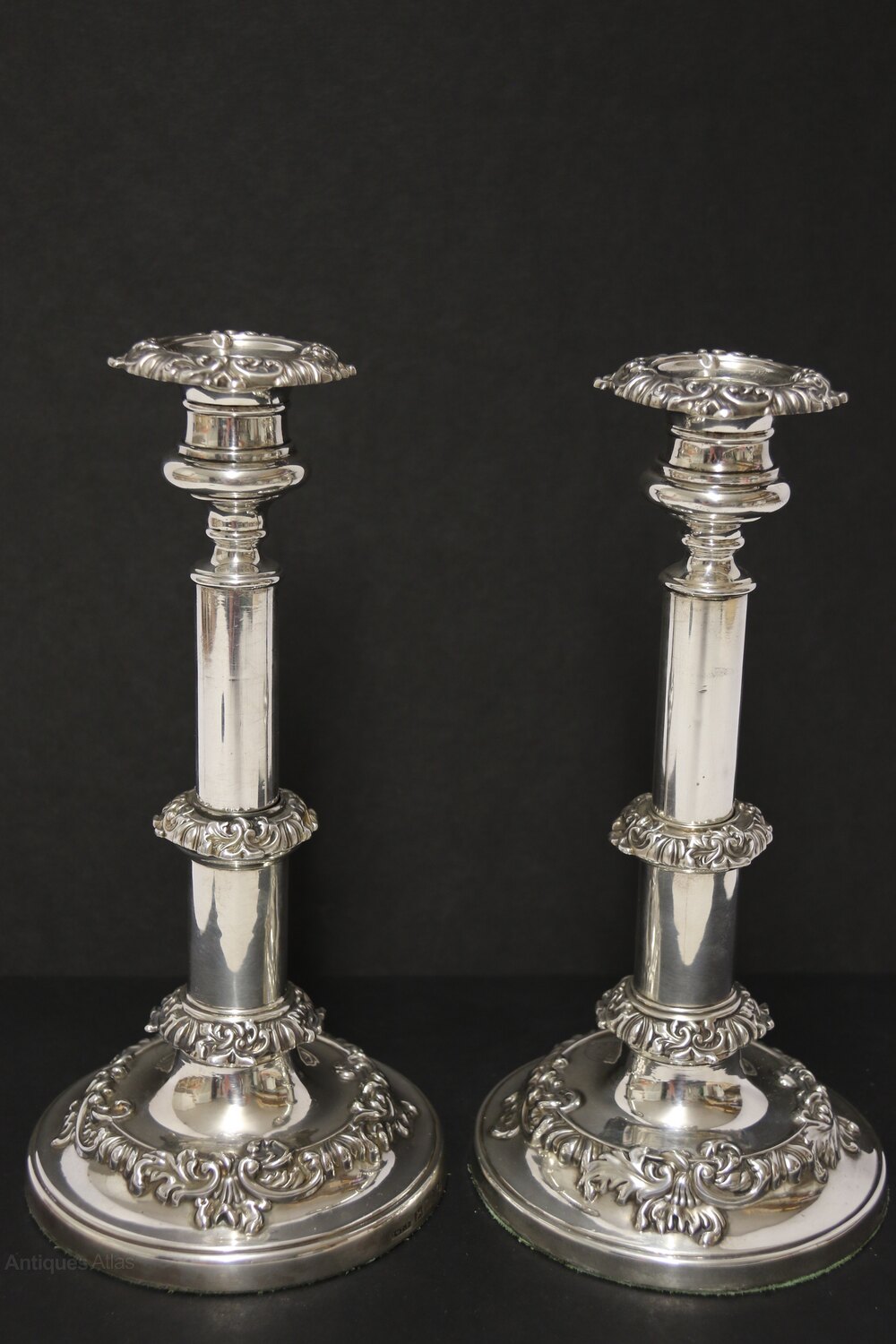This superb pair of English hallmarked silver telescopic candlesticks was hallmarked in Sheffield one 1815 – 16 and the other 1816 – 17. Undoubtedly, both were made in 1816 by silversmiths John and Thomas Settle 1814 – 1825. They were noted as fine makers of candlesticks, coasters, cruet sets, inkwells, and toast racks. This fine pair of candlesticks is of a plain design with wreaths and collars of ornate foliate decoration. The columns are made in two parts, which form the telescopic action, giving a variety of different heights at which they can be displayed. Both are monogrammed on the bases and sconces. The sconces are separate and can be removed for cleaning. Both candlesticks are in good original condition with a few very minor age-related marks.