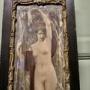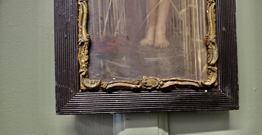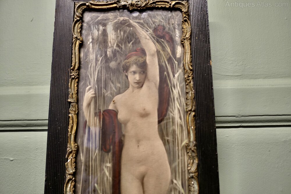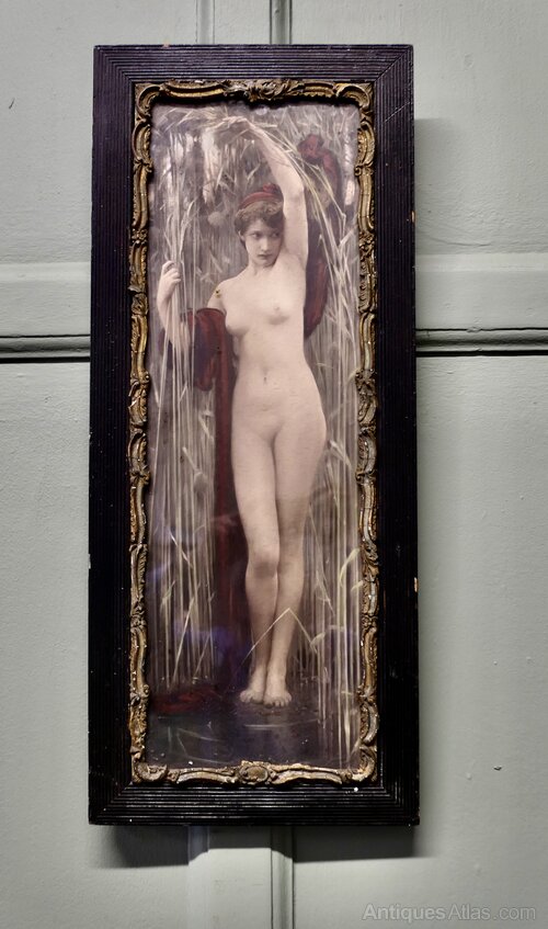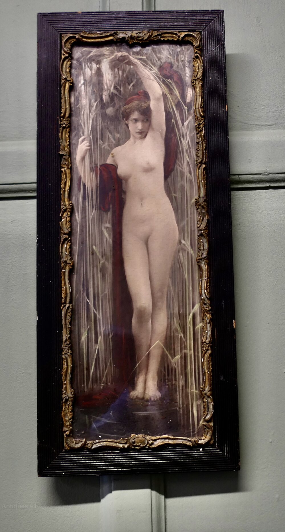 Syrinx was a mythological naked female figure with dark hair and dark red drapery falling from her arms, standing at the edge of a river amongst tall reeds. She is posed with her left arm stretched up over her head, her right arm grasping the reeds beside her, at the water's edge, her feet partly submerged in the river. She gazes off to the right of the picture with a solemn expression