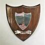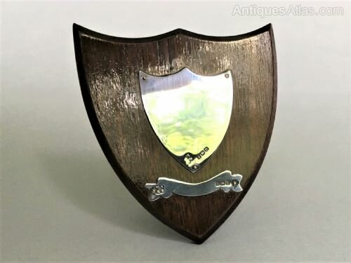 A useful small silver mounted trophy shield, dating from the reign of George V. This attractive piece is of wooden easel back form and is suitable for standing on a table or in a cabinet. The hallmarked silver shield and separate scroll beneath are both vacant and ready for engraving. A wonderful gift idea for that special event or achievement.