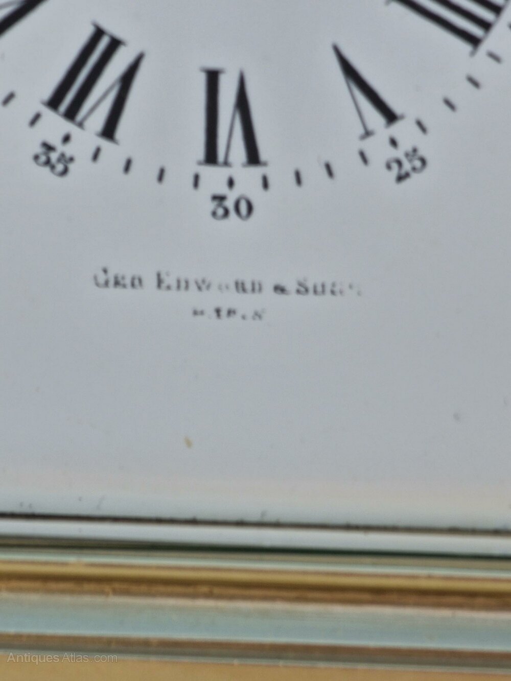 A smaller proportioned French brass cased striking & repeating carriage clock. An enamel dial with Roman numerals and blued steel hands. Fluted side columns and stepped mouldings to the base and top. The dial is signed 'Geo. Edward & Son, Ripon' as the retailer. An 8-day duration mechanism striking the hours and 1/2 hours on a gong. A lever escapement visible through the oval top glass. A repeater button to the top. Nu,mbered 4721. Circa 1900.