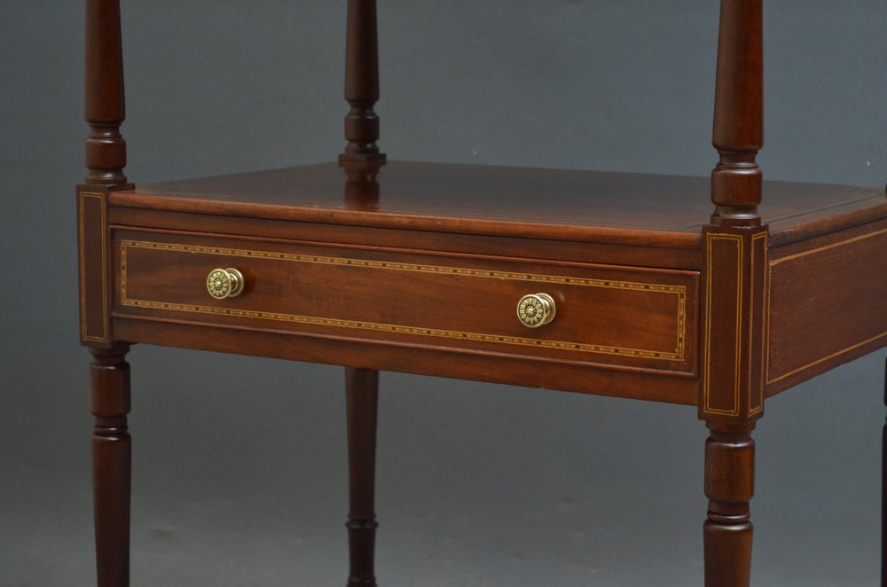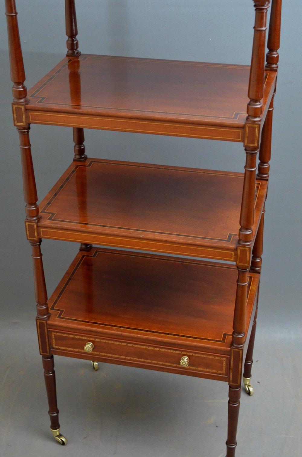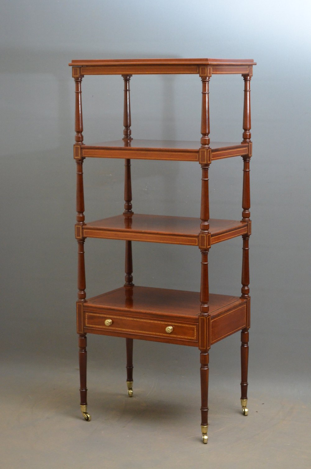 Sn3865 A fine example of late Victorian, mahogany and inlaid whatnot / étagère, having 4 rosewood crossbanded tiers on elegant turned supports and inlaid, mahogany lined drawer to base fitted with original brass handles, standing on turned legs terminating in original brass castors. This is a truly excellent inlaid whatnot in wonderful condition throughout. c1890