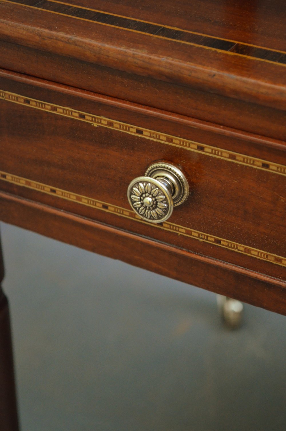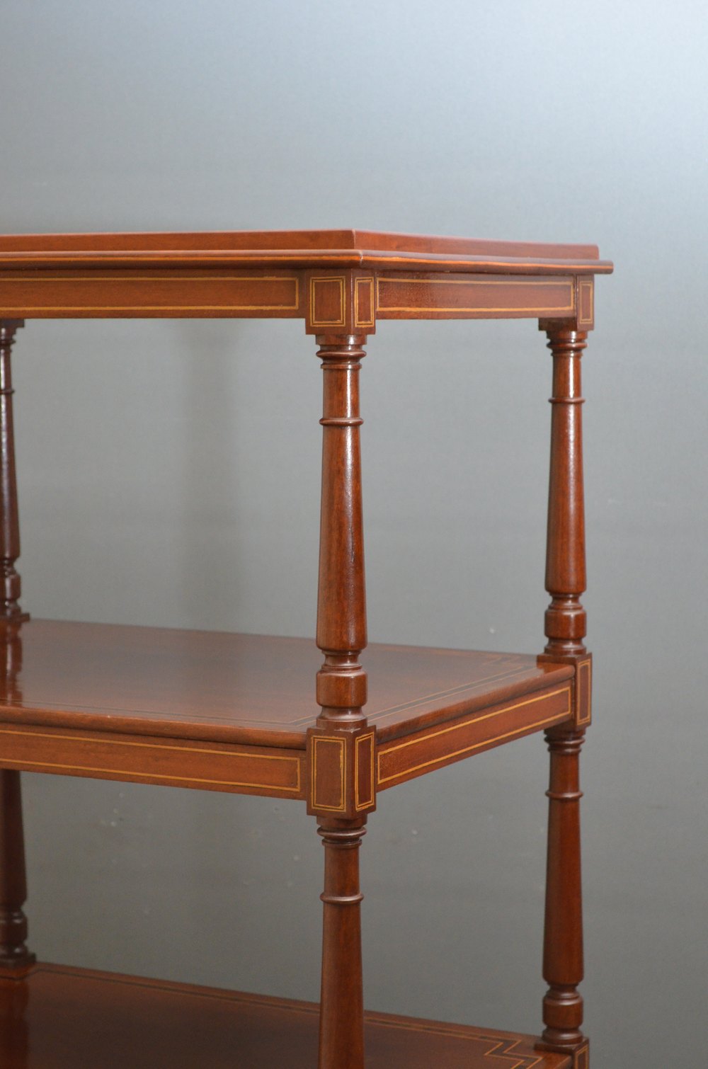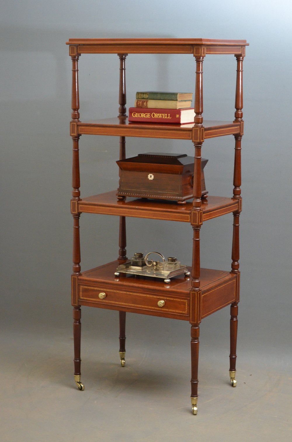 Sn3865 A fine example of late Victorian, mahogany and inlaid whatnot / étagère, having 4 rosewood crossbanded tiers on elegant turned supports and inlaid, mahogany lined drawer to base fitted with original brass handles, standing on turned legs terminating in original brass castors. This is a truly excellent inlaid whatnot in wonderful condition throughout. c1890