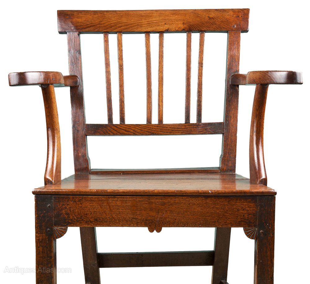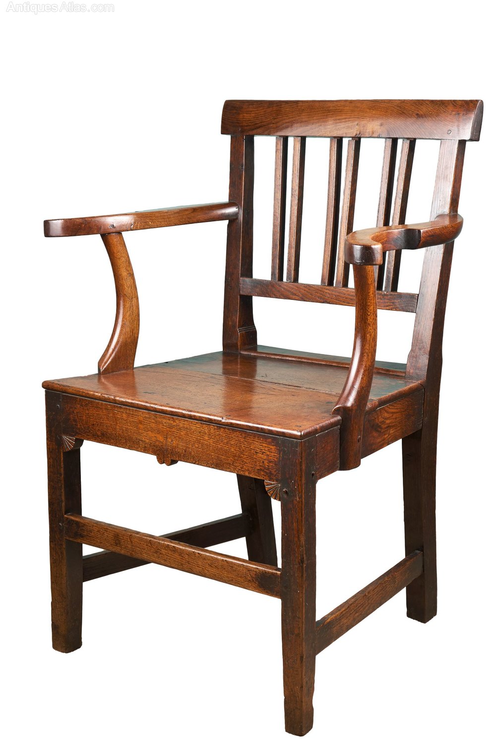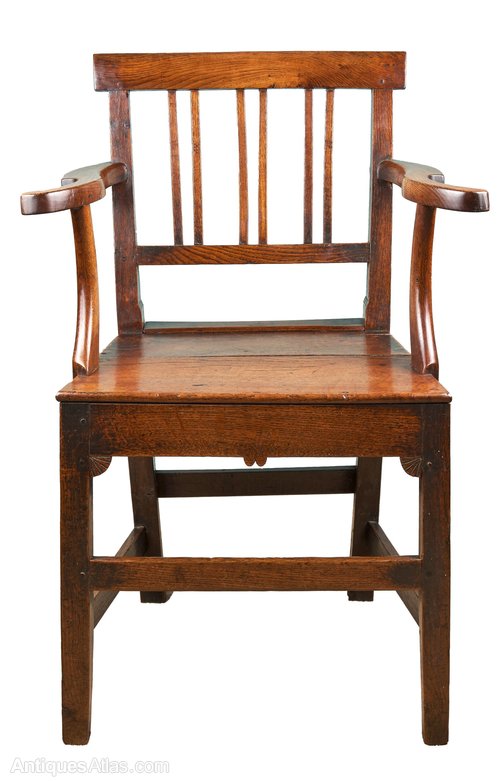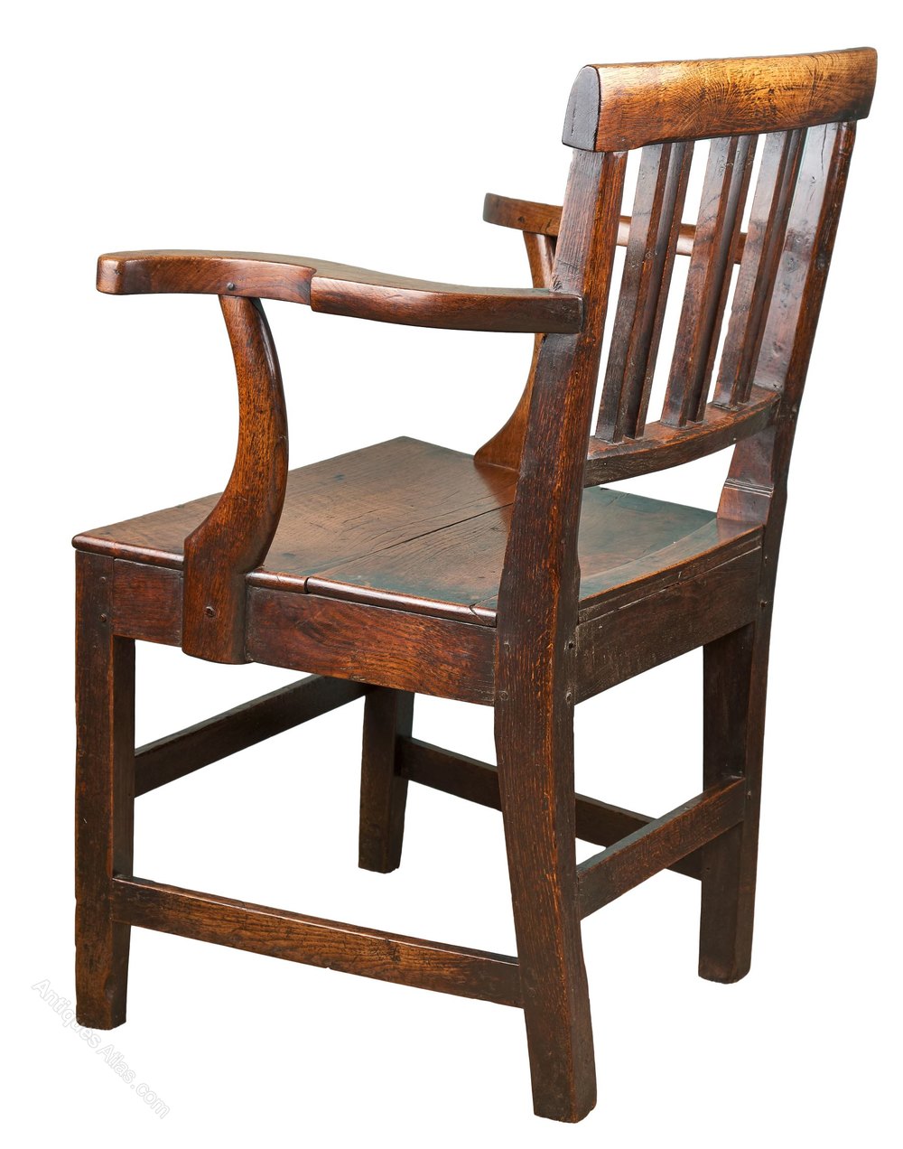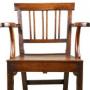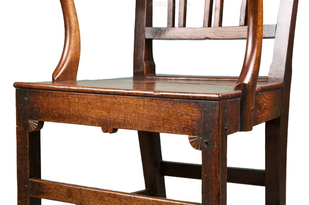 An early 19th century Welsh elbow or armchair, made entirely from dense,native oak of excellent colour and patina and with unusual and attractive detail-the shaped front seat rail with a pair of fanburst spandrels all cut from a single piece, the elegantly shaped and outswept arms with rounded, curved and tapering supports.