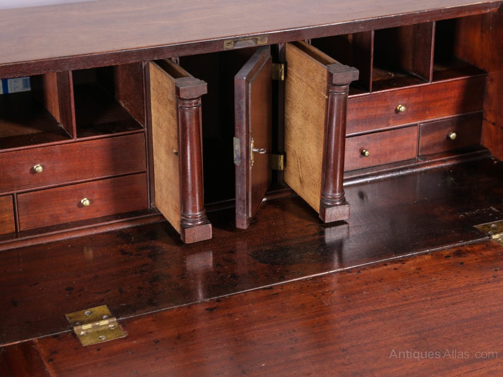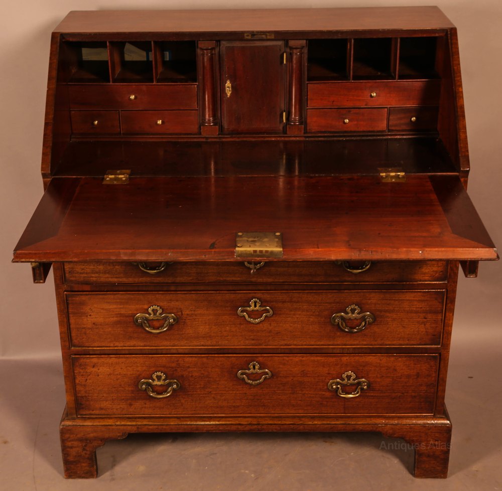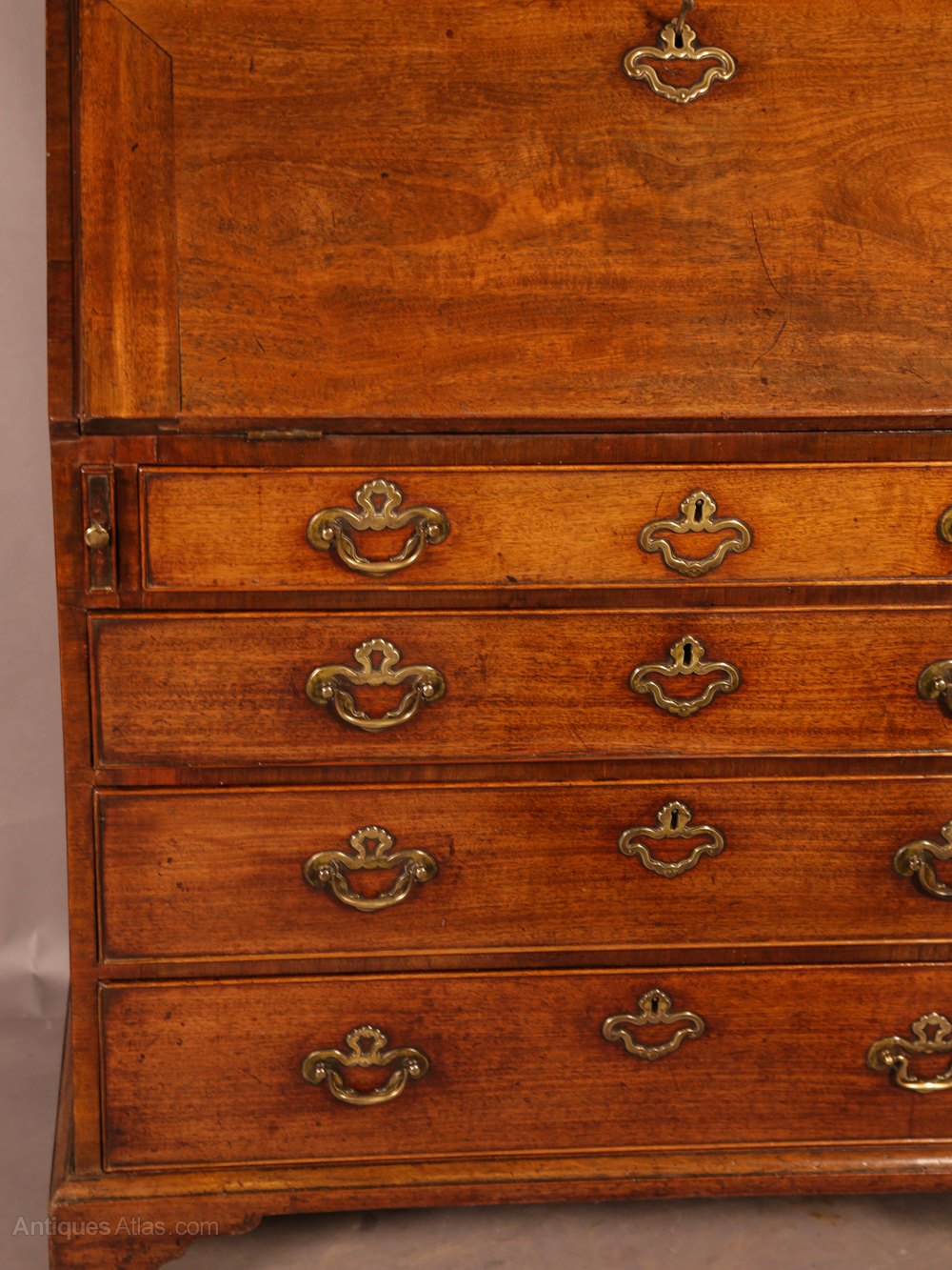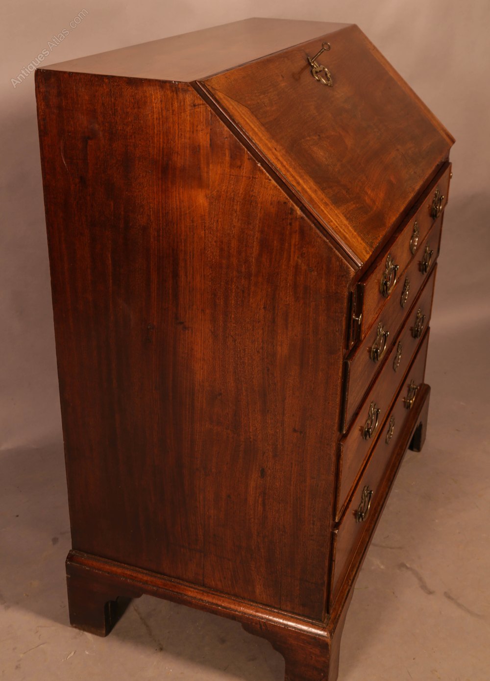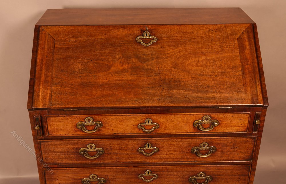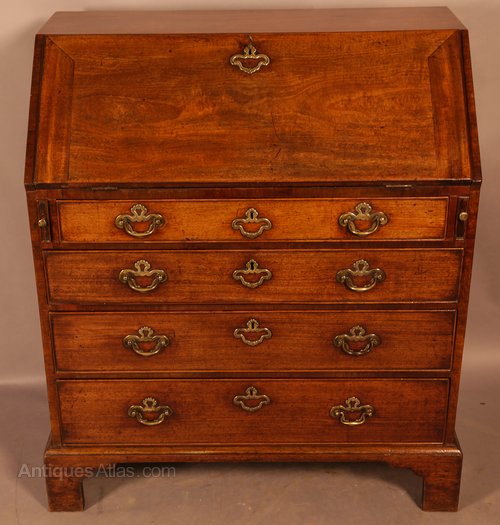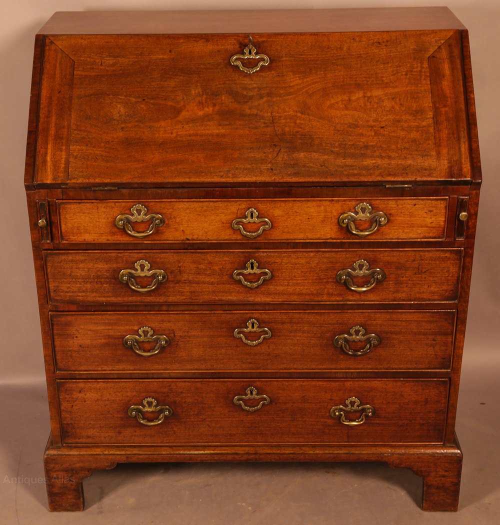 An Excellent 18th century Writing Bureau just 3 feet wide. it has a very good interior, the fall sits square and has the original lock and key, the bracket feet have not lost any height, Oak drawer linings , the fantastic handles and key escutcheons are original it has a great colour and patina. The condition is excellent a superb pieace of Georgian Furniture vastly under valued these days