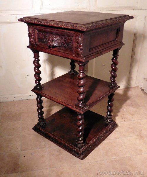This useful little stand has three tiers, supported on chunky barley twist supports, the top has a carved edge, below this there is a carved drawer and below this there are two more tiers, the base plinth is carved matching the top