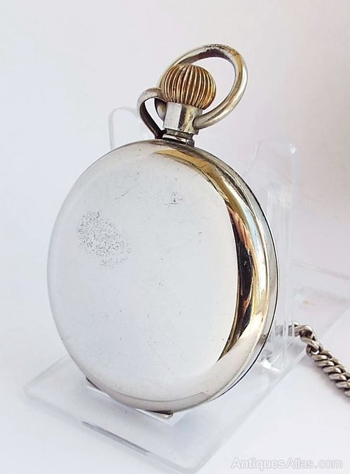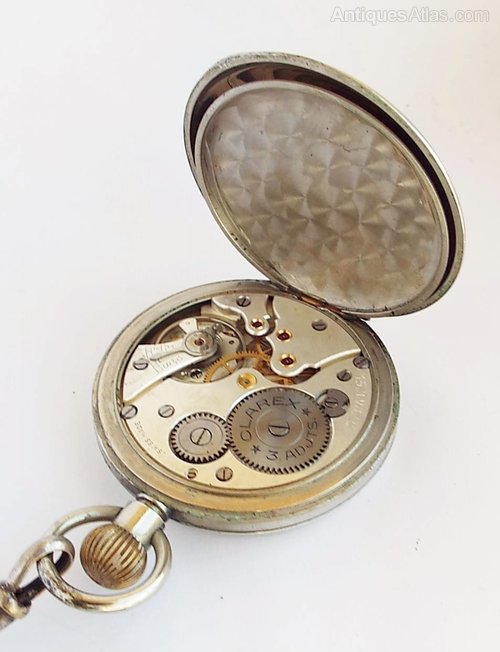 The watch measures 49.8 mm diameter excluding the winding stem and the loop. The nickel case has light surface marks from use and a small "ding" to the back but overall it is in nice condition for a 1930s piece.