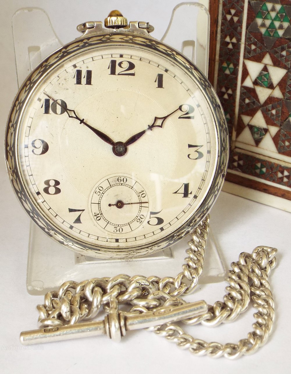 The watch comes on a silver albert chain which measures 25.5cm including the T bar and clasp.