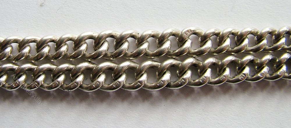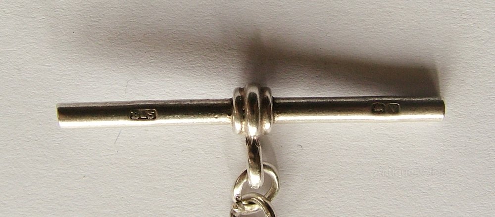 The chain is hallmarked on the T-bar and clasps for 1945 with a maker’s mark B & S. Each of the links has the lion passant silver mark and the chain is also stamped with the B & S makers mark. Each chain measures 21cm long including the T-bar and the clasp.