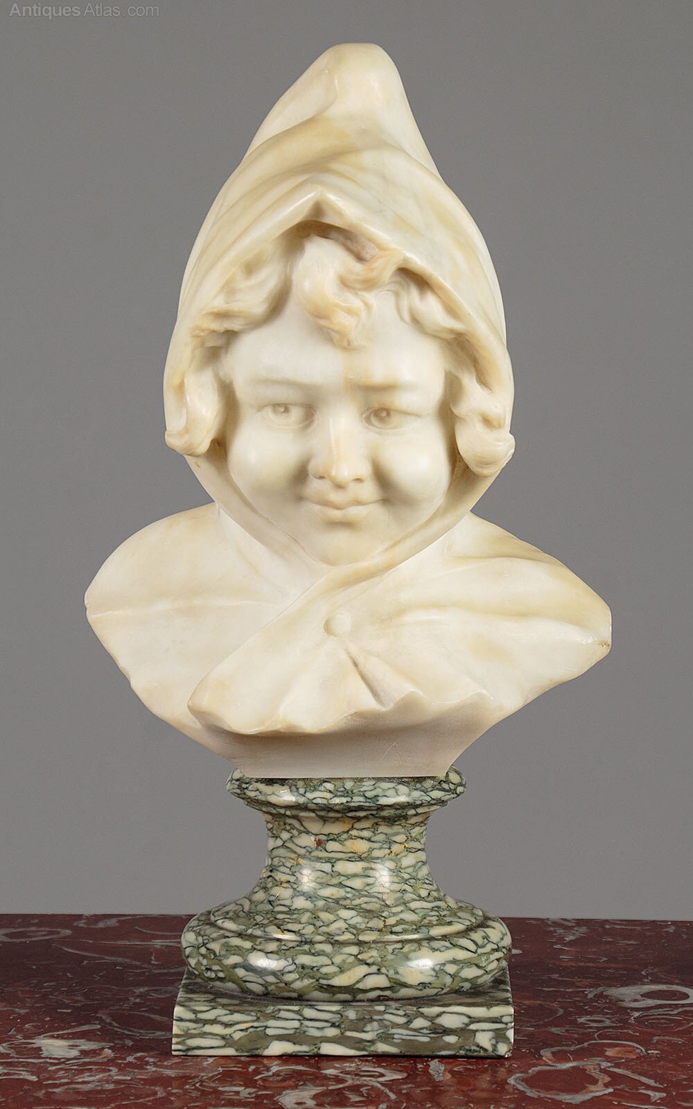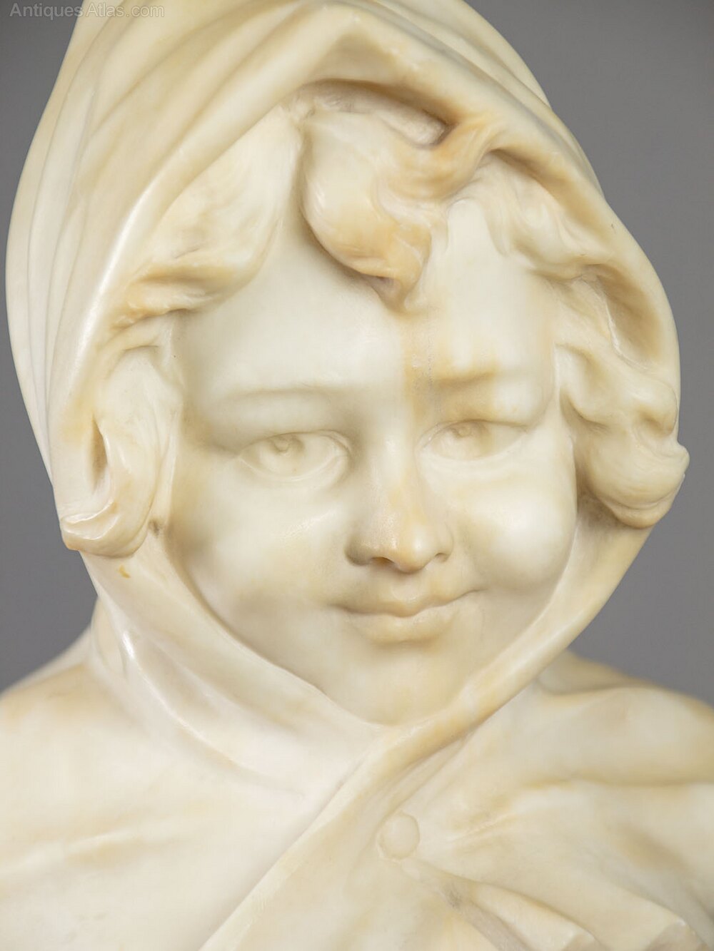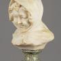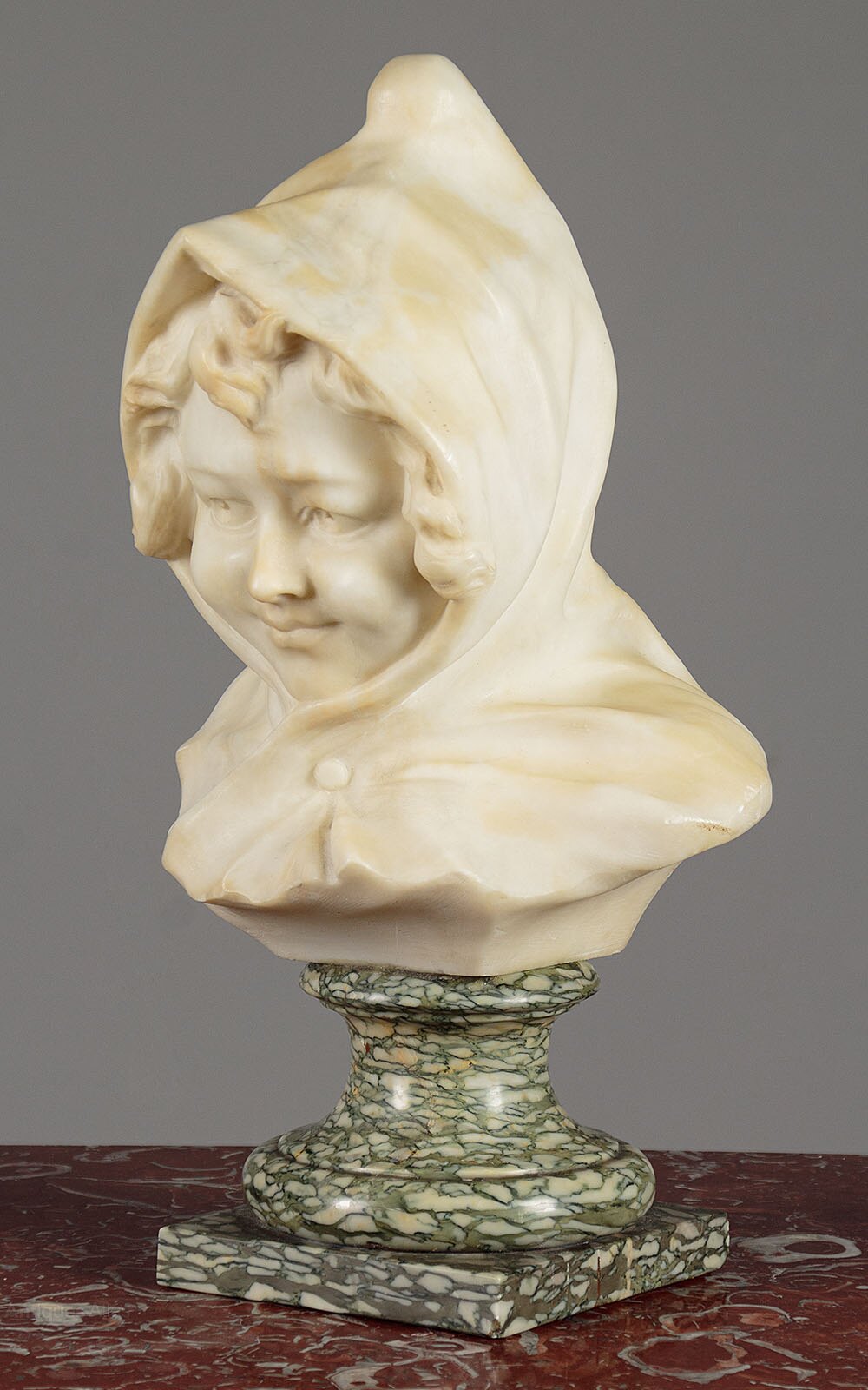 Charming little carved bust of a girl c.1900. Very well carved in white alabaster as a young girl with a smiling face and apple cheeks framed with curling hair and the hood of a cape fixed tight below her chin. Mounted on an attractively figured and turned green marble plinth. Signed at the rear of the bust Prof P. Del Lunga. Very good condition.