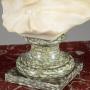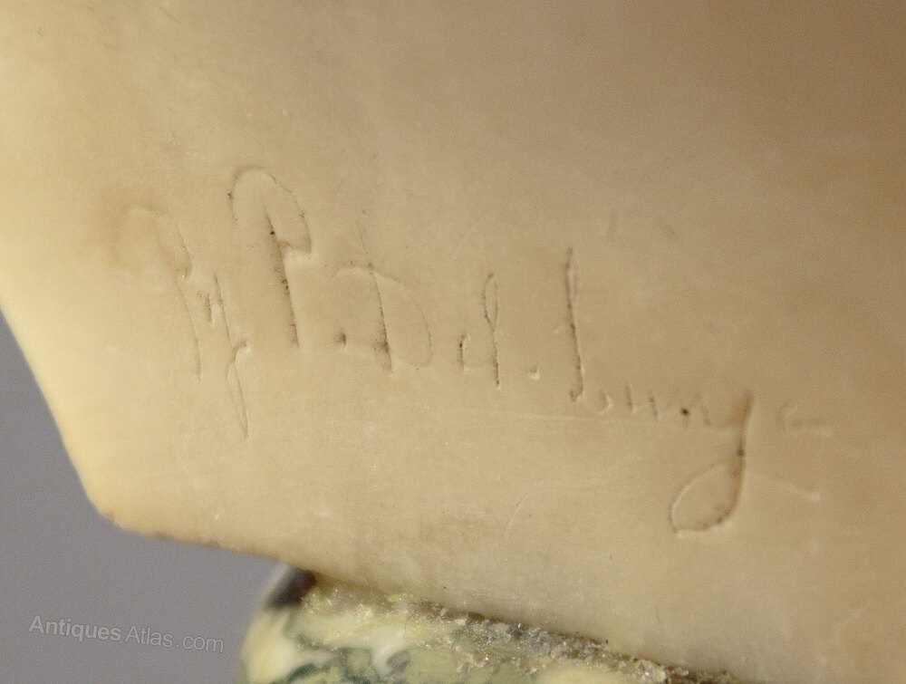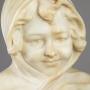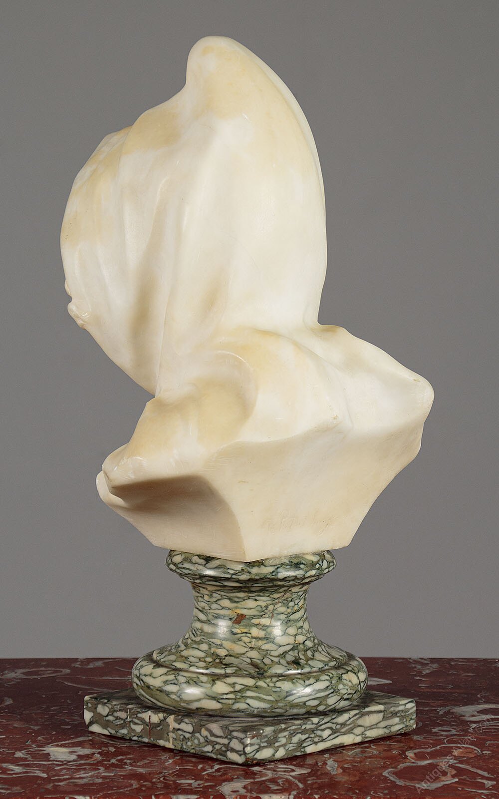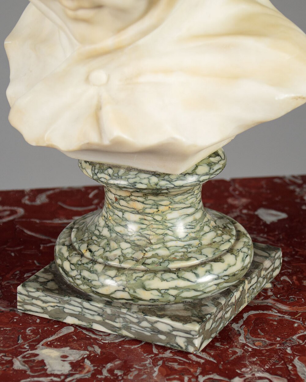Charming little carved bust of a girl c.1900. Very well carved in white alabaster as a young girl with a smiling face and apple cheeks framed with curling hair and the hood of a cape fixed tight below her chin. Mounted on an attractively figured and turned green marble plinth. Signed at the rear of the bust Prof P. Del Lunga. Very good condition.