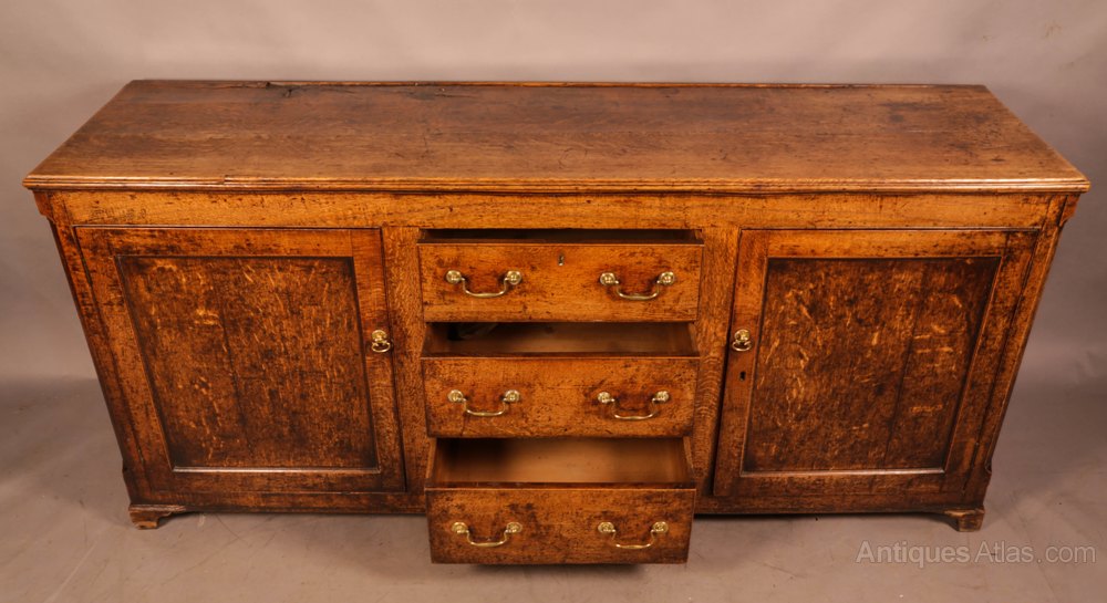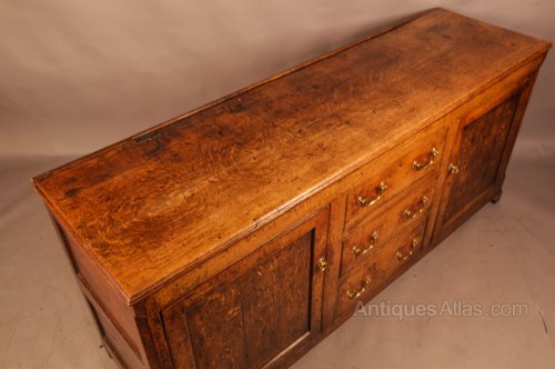 A Good 18th century Serving Dresser in Oak it has three drawers and two cupboards all with original brass ware, each cupboad has a shelf,The condition is excellent and it has gained a very pleasing colour and patination of the years.