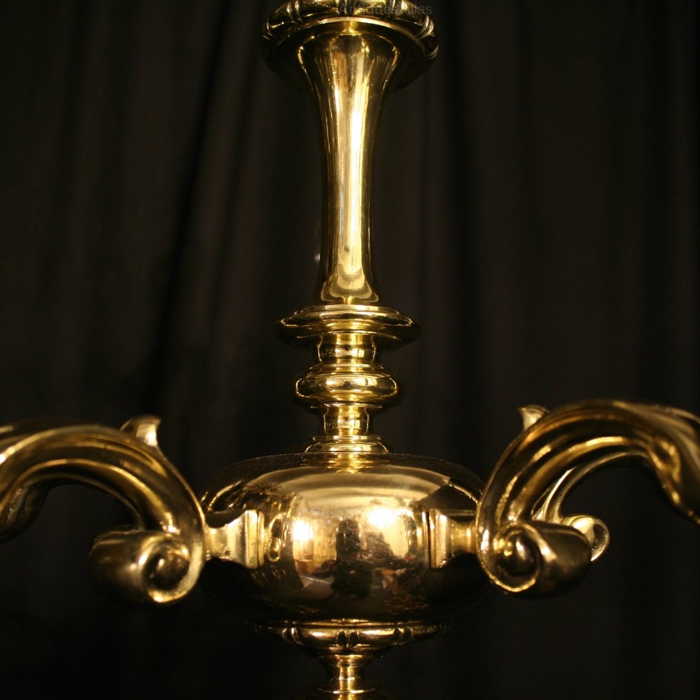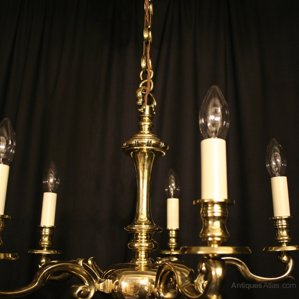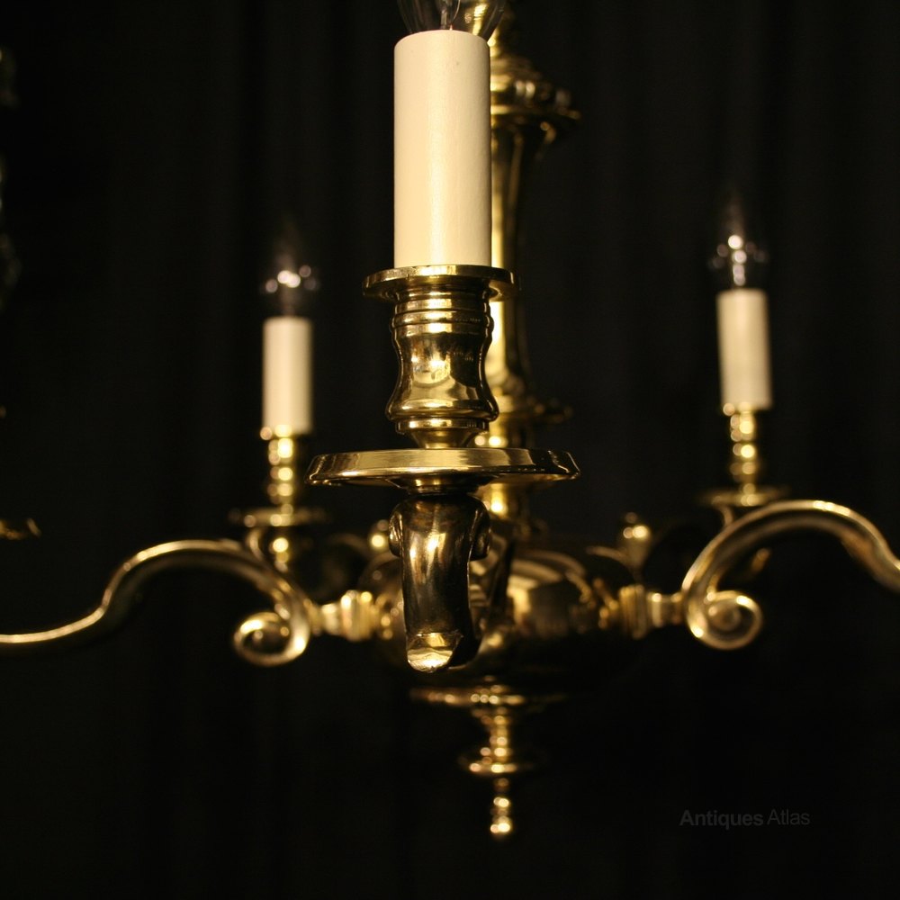 A nice English repolished cast brass 5 light antique chandelier, the heavy scrolling arms with circular bobeche drip pans and bulbous candle sconces, issuing from a tapering central column and bulbous base with reeded terminal, sympathetically repolished and lacquered with the original chain and ceiling rose, great colour and nicely cast. Fully rewired and PAT tested. We have a matching pair of wall light stop go with this chandelier if required. All our chandeliers come with bulbs and ceiling fixings.
