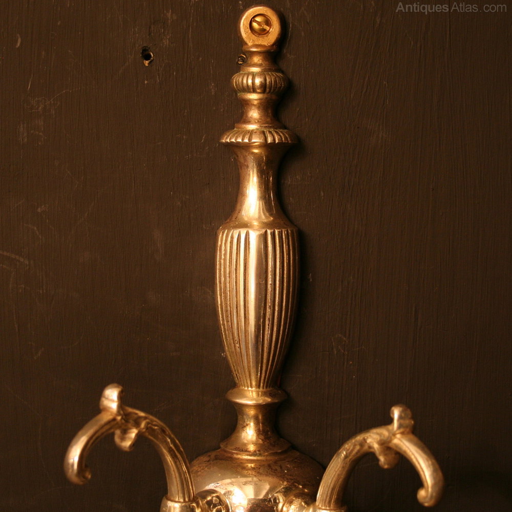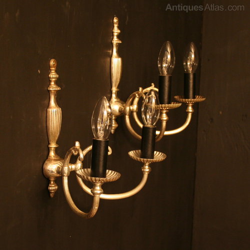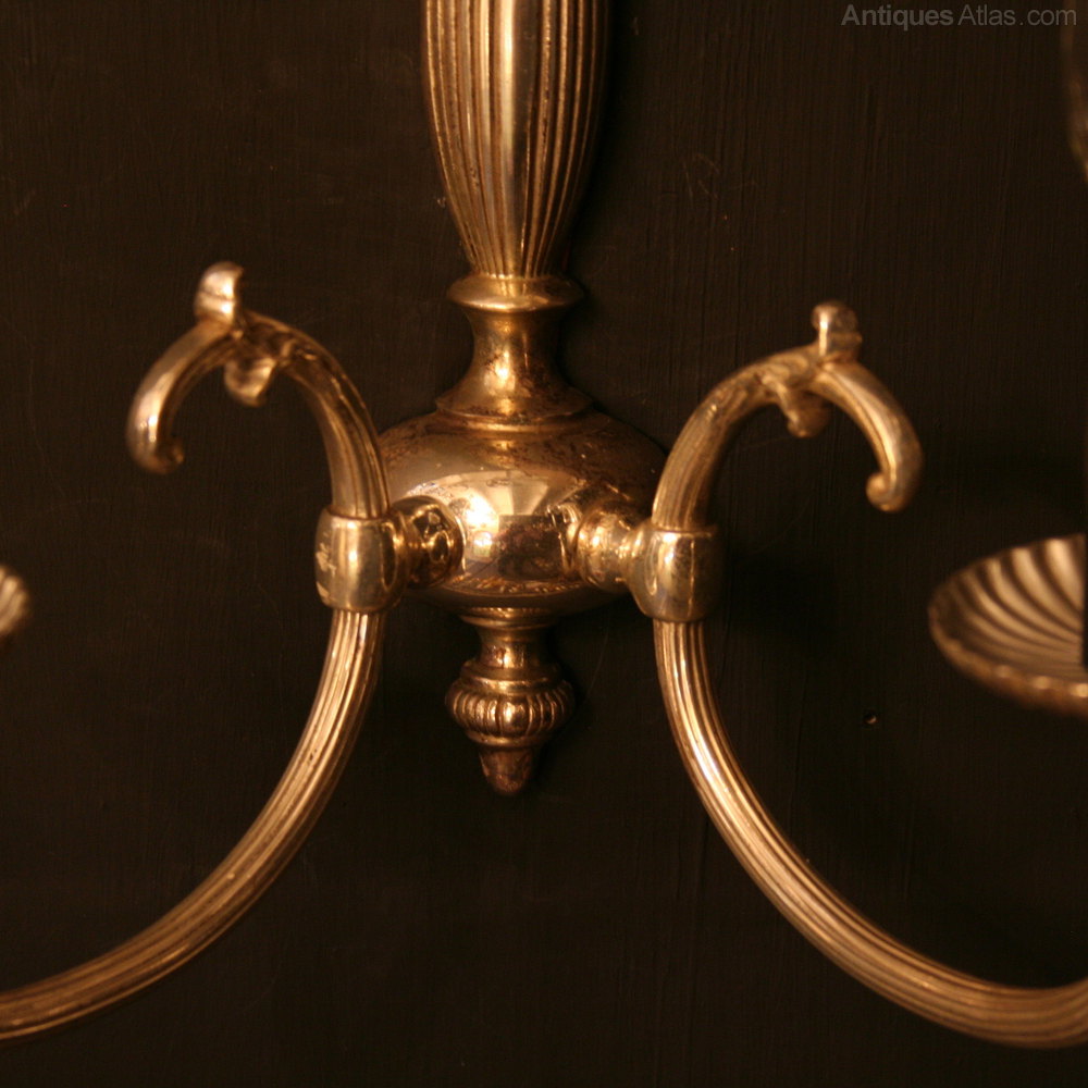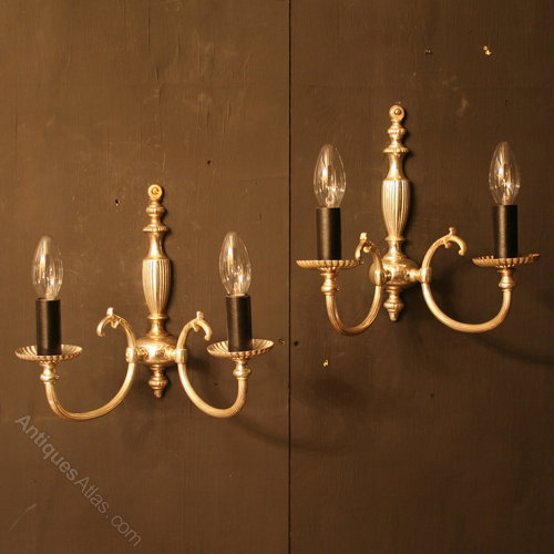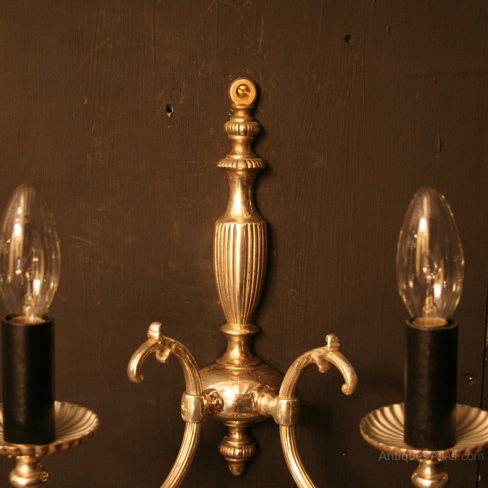 An English pair of twin arm silvered brass wall lights, the simple reeded scrolling arms with reeded drip pans, issuing from an elongated reeded backplate, nice patination and great size. Fully rewired and PAT tested. All our wall lights come with aged brass screws for fixing and spare bulbs. These wall lights appear more gold in the pictures but it is a silver colour.