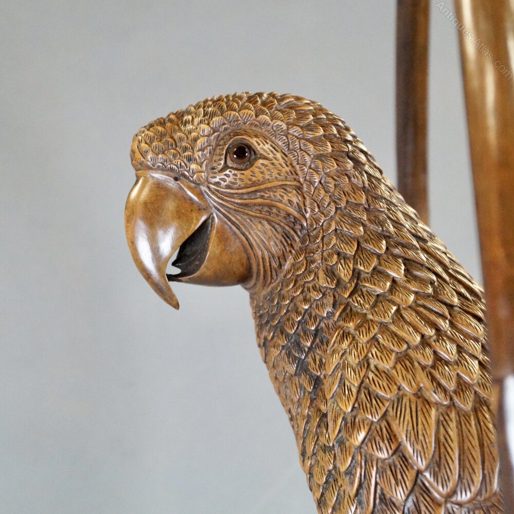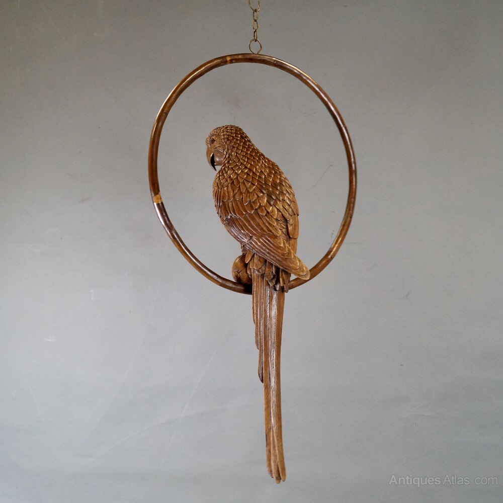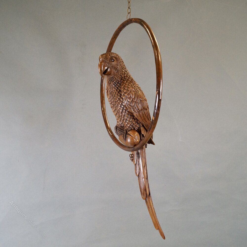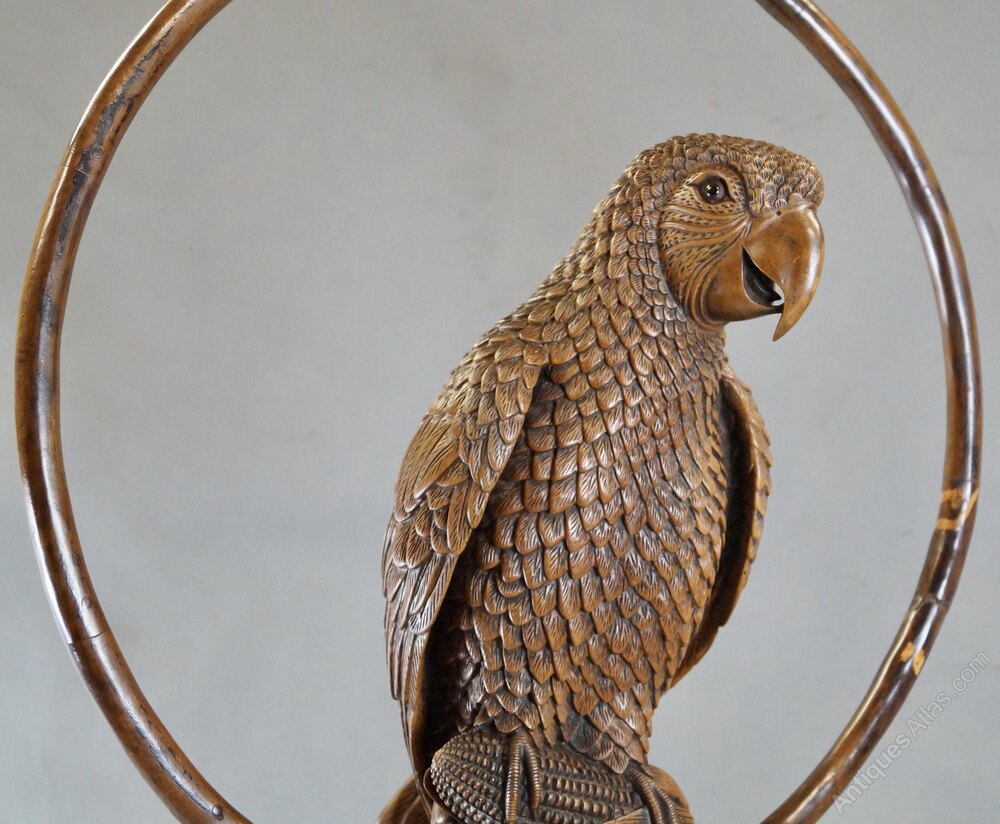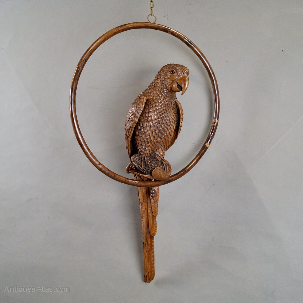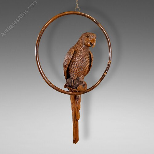 An exceptional & rare Black Forest life size parrot. Carved in great detail in Linden wood and retaining its original hoop perch and lovely waxed finish. Measurements without the hoop, 710mm high,160mm wide and 260mm deep. German. Circa 1880.
