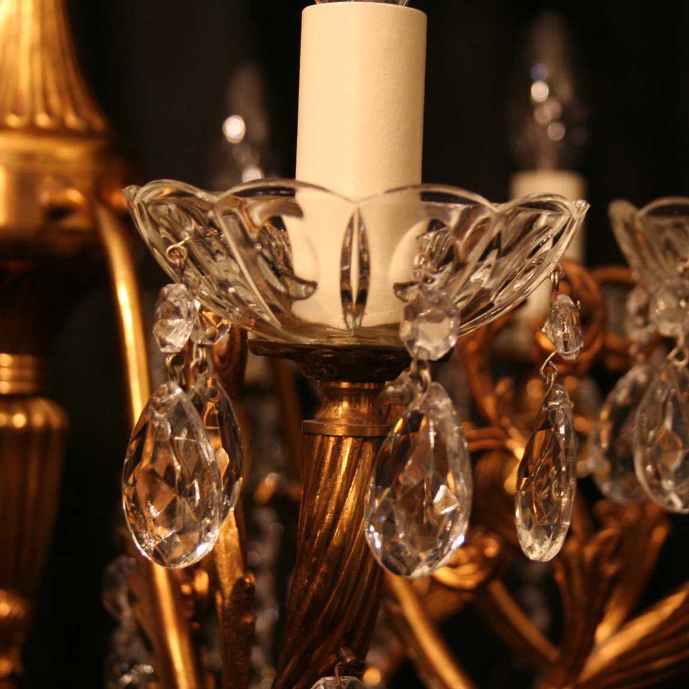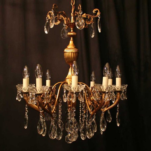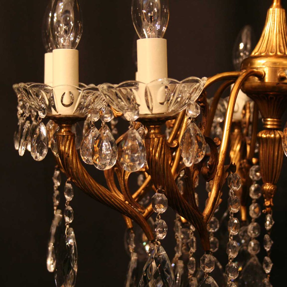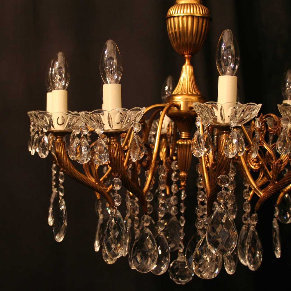 An Italian gilded cast brass and cut glass 10 light chandelier, the barley twist scrolling arms with glass drip pans issuing from a reeded baluster central column, reeded finial and scrolling top canopy, decorated overall with faceted cut glass pendants and having the original chain and ceiling rose. Fully rewired and PAT tested. All our chandeliers come with bulbs and ceiling fixings.