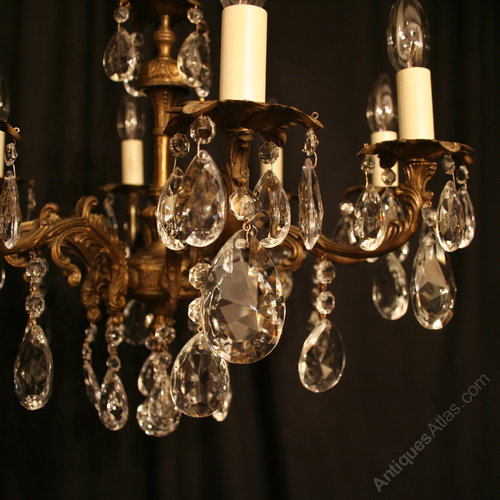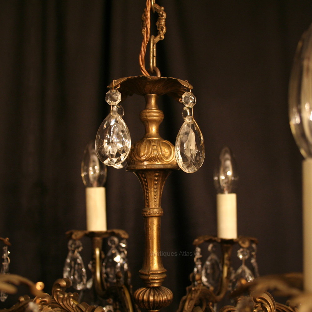 An Italian dark gilded cast brass and cut glass 8 light antique chandelier, the leaf scrolling arms with foliated cast pans issuing from a bulbous central column, decorated overall in faceted cut glass pendants and having the original chain and ceiling rose, nice original patination and good size. Fully rewired and PAT tested. All our chandeliers come with ceiling fixings and spare bulbs.