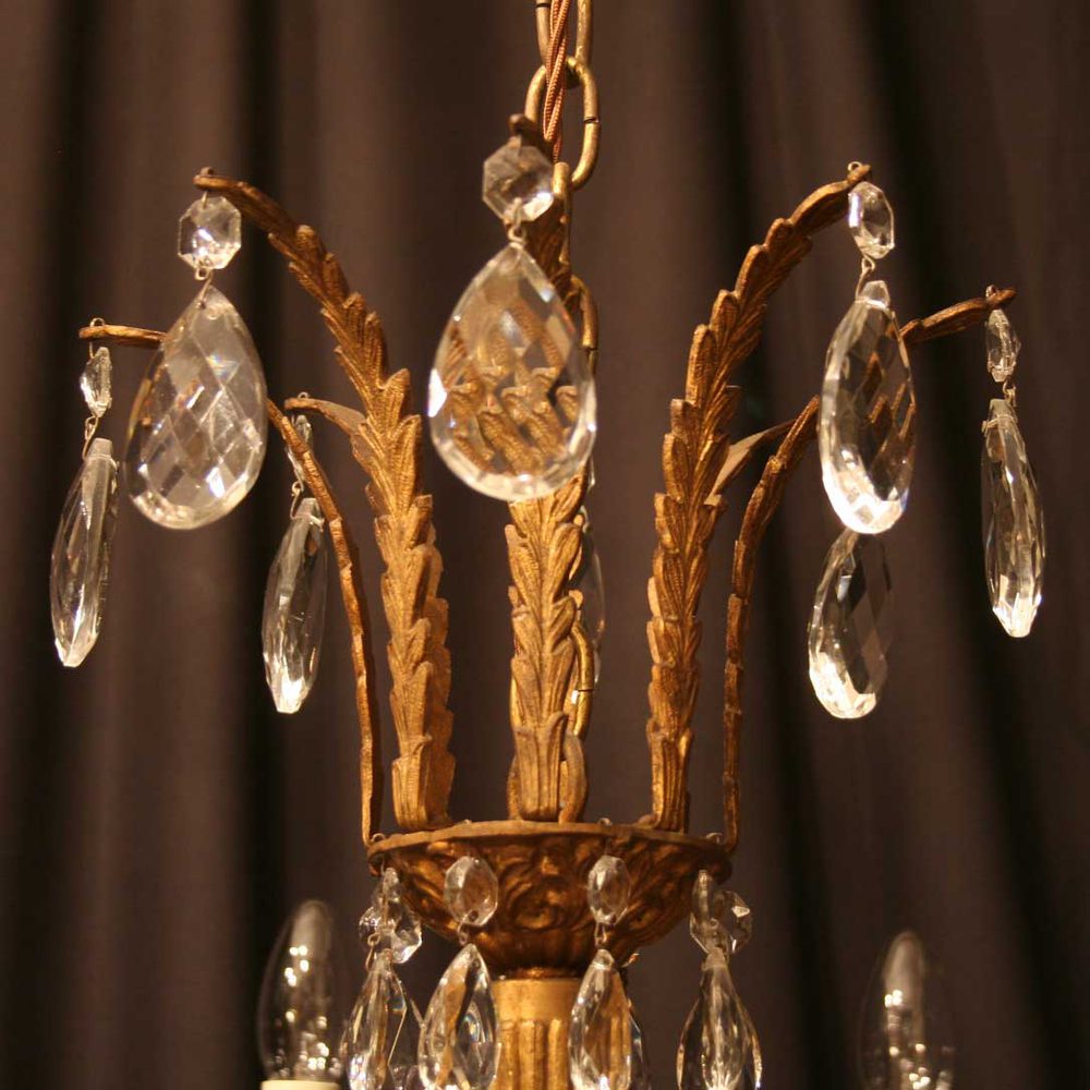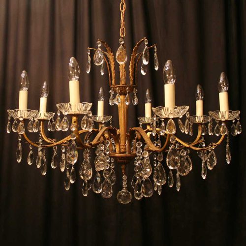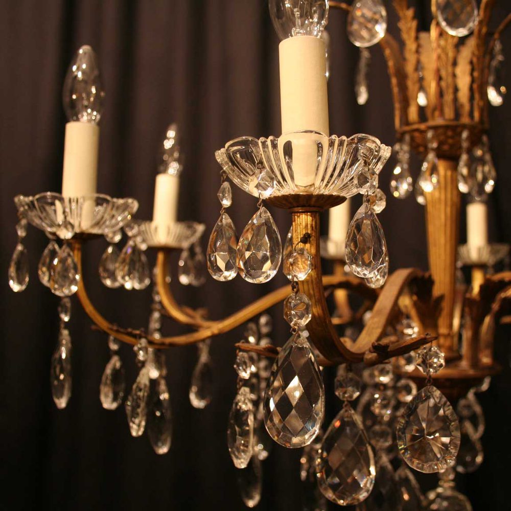 An Italian gilded cast brass and cut glass 8 light chandelier, the Acanthus leaf reeded square gauge scrolling arms with glass drip pans issuing from a tapering central column and foliated canopy, decorated overall with faceted crystal cut glass pendants, with original chain and ceiling rose. Fully rewired and PAT tested. All our chandeliers come with bulbs and ceiling fixings. Ideal for large room with low ceiling.