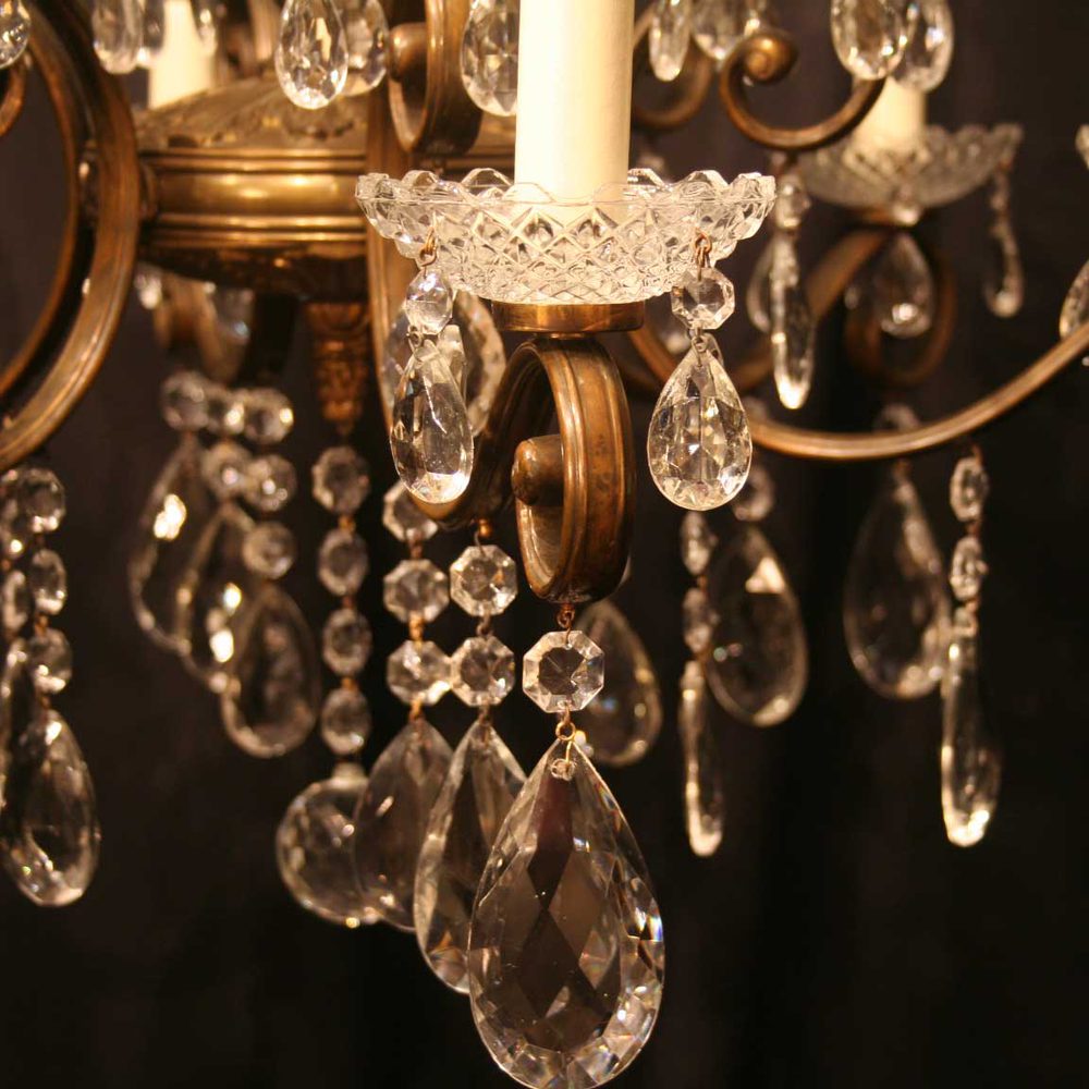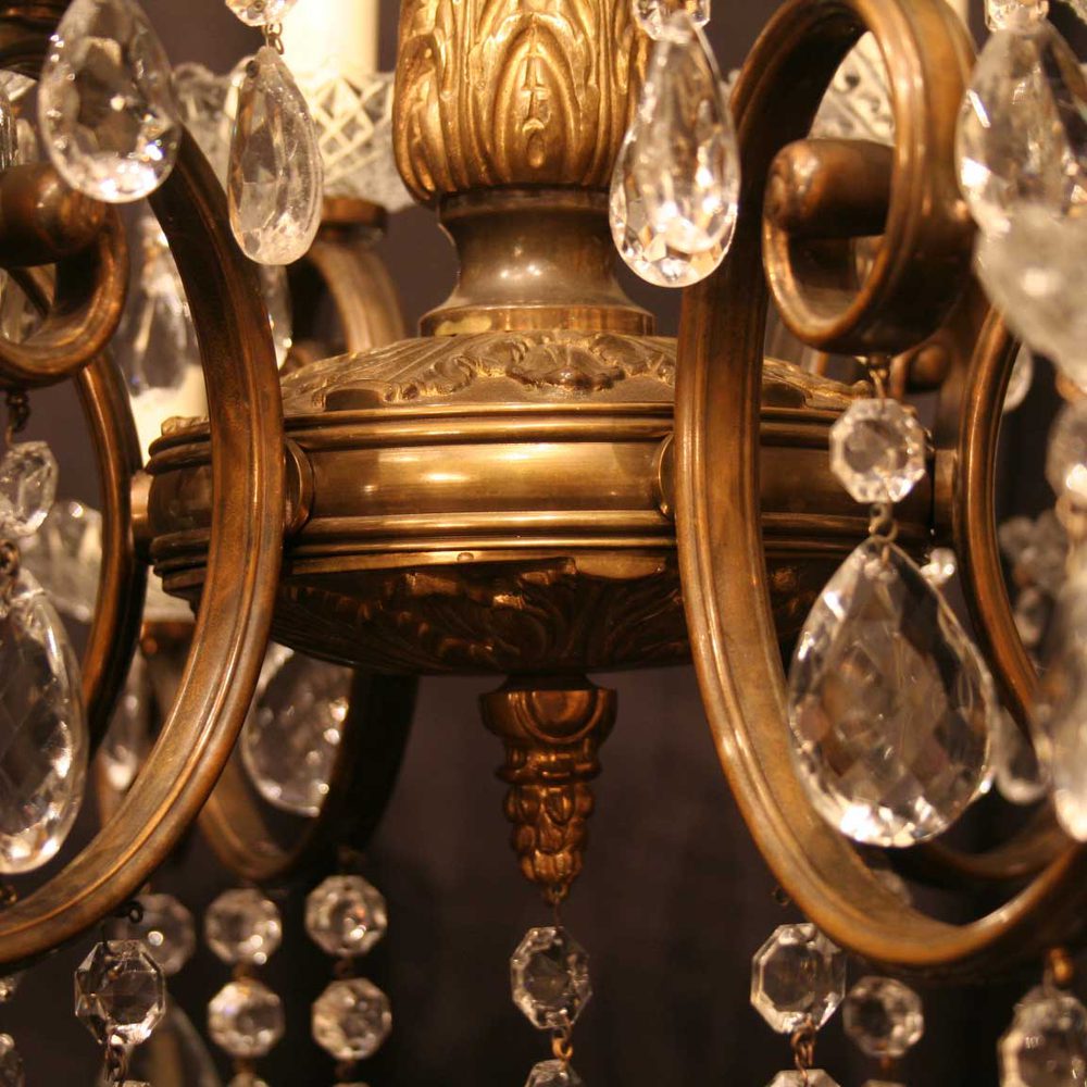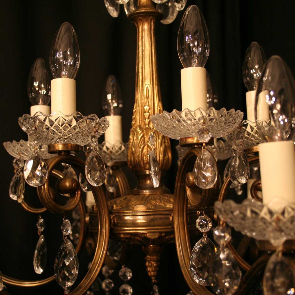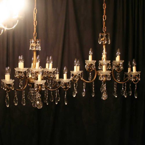 An Italian pair of dark gilded cast brass and cut glass 12 light double tiered chandeliers, the reeded scrolling arms with glass drip pans issuing from an Acanthus leaf baluster central column, decorated overall in faceted crystal cut glass pendants and having the original chain and ceiling rose. Fully rewired and PAT tested. All our chandeliers come with ceiling fixings and spare bulbs.