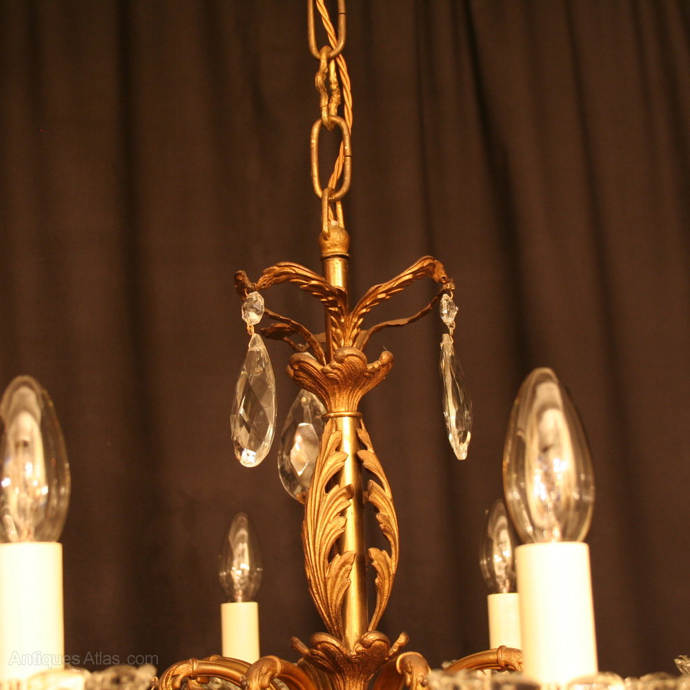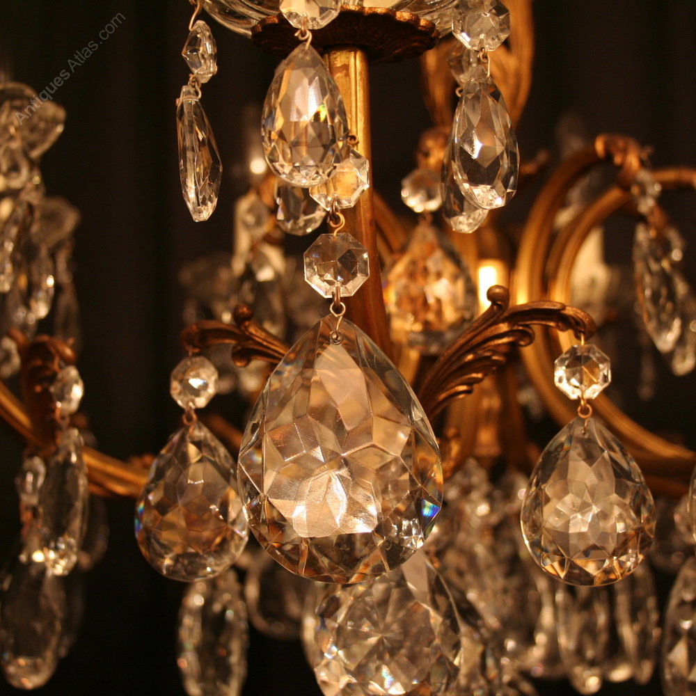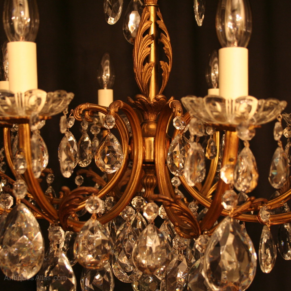 An Italian pair of gilded cast brass and cut glass 8 light antique Chandeliers, the Acanthus leaf scrolling arms with glass drip pans issuing from a foliated Acanthus leaf central column with scrolling leaf canopy, decorated overall with faceted crystal cut glass pendants and having the original chain and ceiling rose, excellent size and lovely patination. Fully rewired and PAT tested. All our chandeliers come with ceiling fixings and spare bulbs