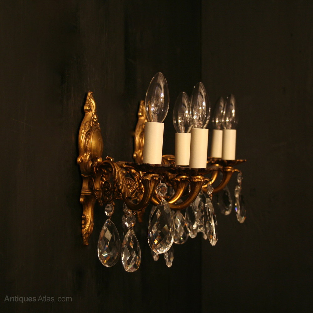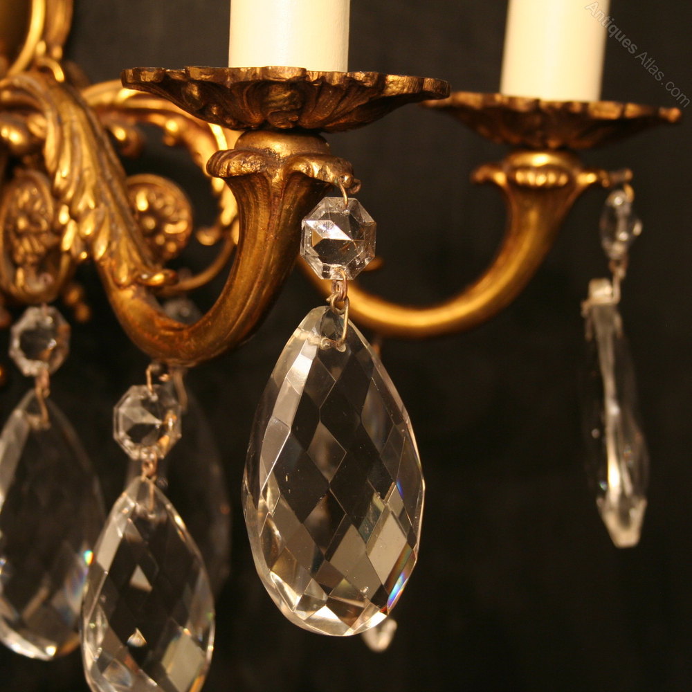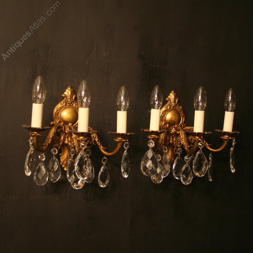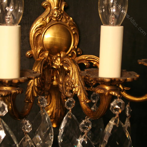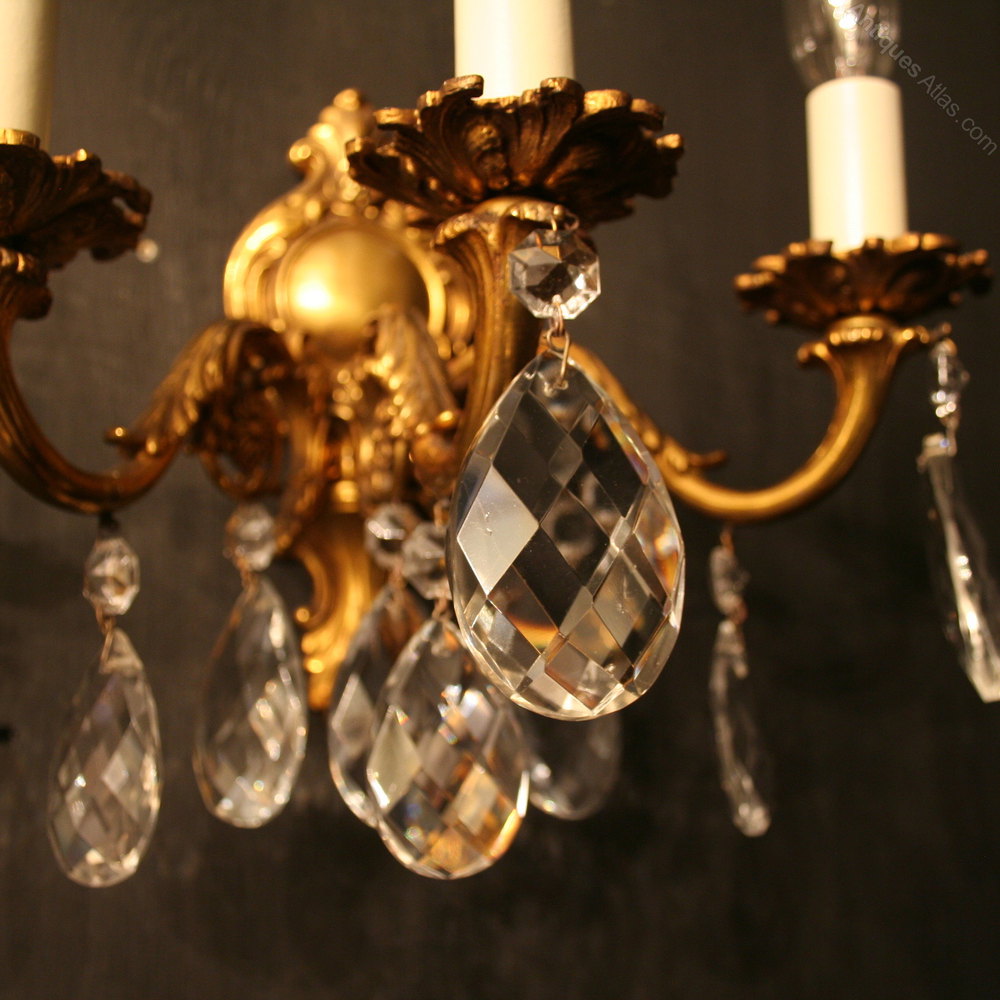 An Italian pair of gilded cast brass and crystal triple arm antique wall lights, the Acanthus leaf scrolling arms with foliated bobeche drip pans issuing from a ornately cast cartouche shaped backplate and decorated overall with crystal faceted pendants, nice size and good patination. Fully rewired and PAT tested. All our wall lights come with aged brass screws for fixing and spare bulbs.