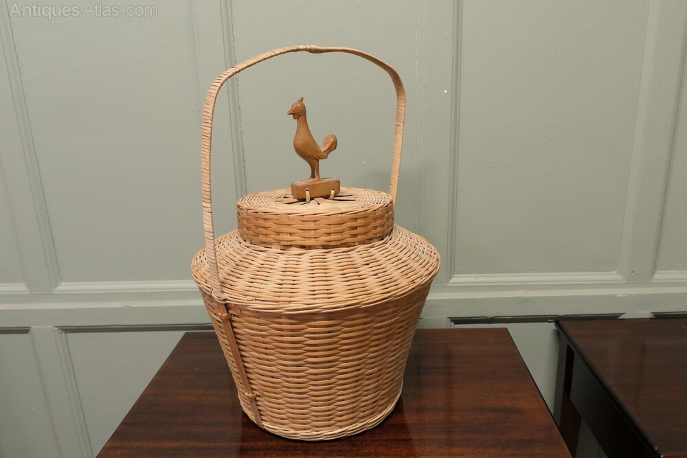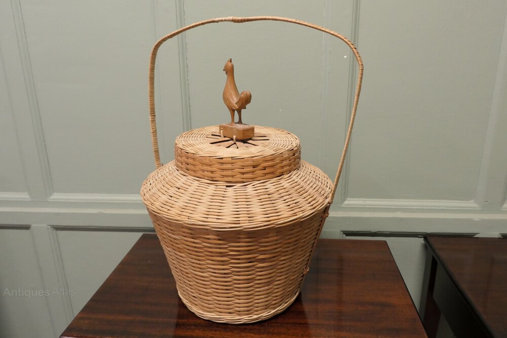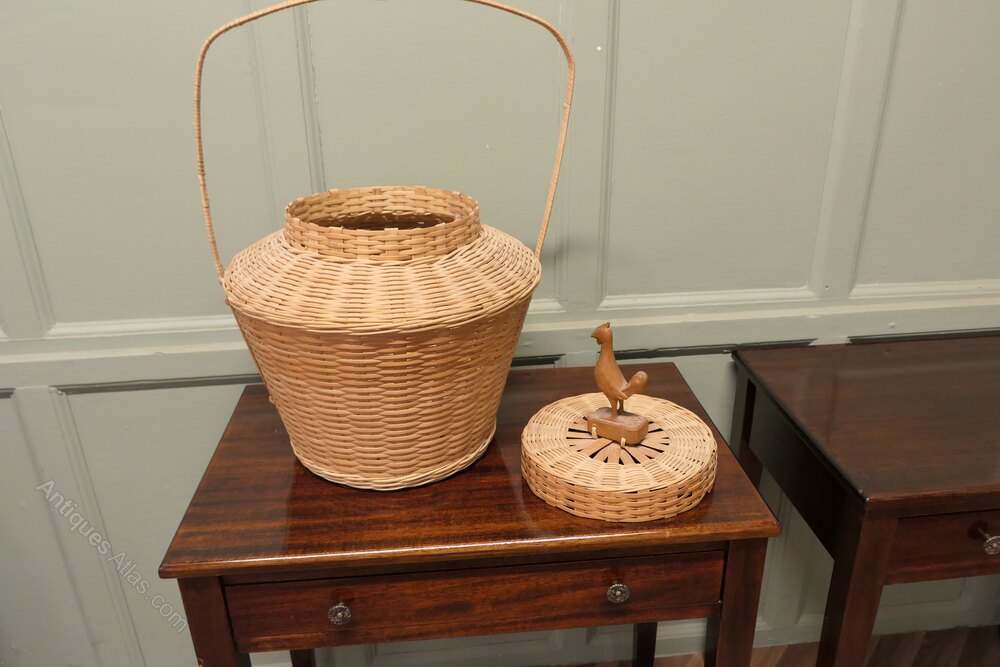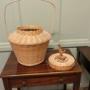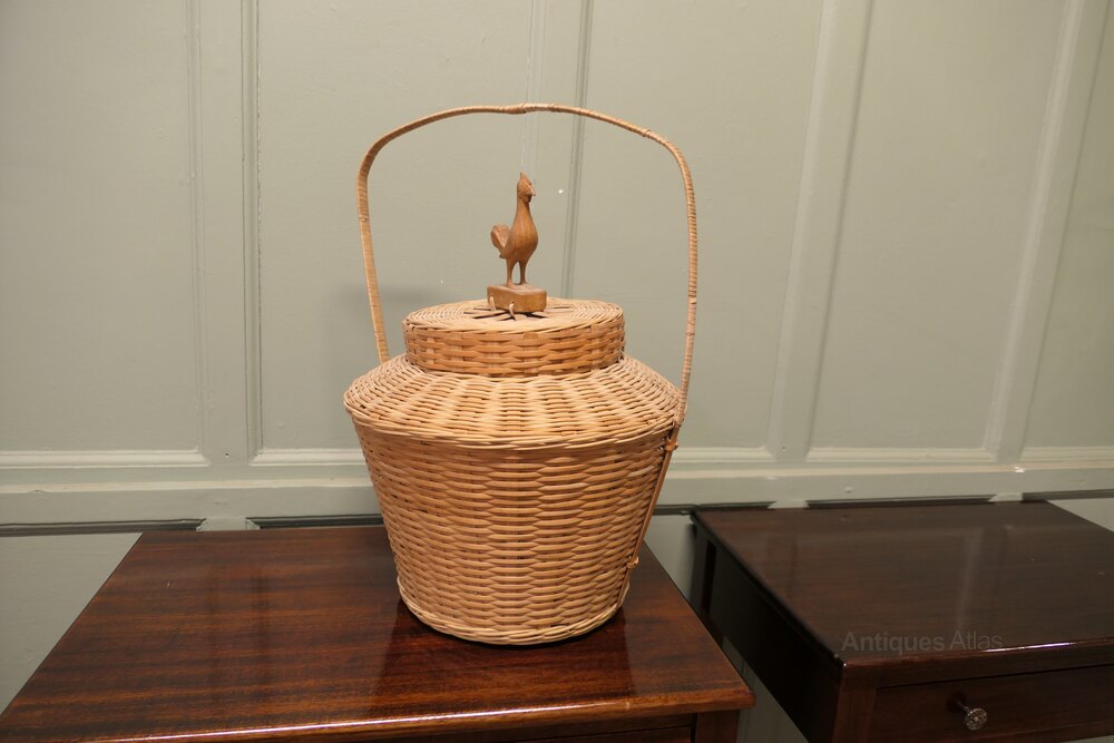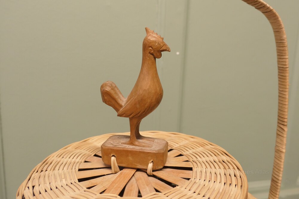 This is a very attractive basket with a round lid which has a carved chicken as a handle, this gives a clue to the intended purpose of the basket, yes it is for carrying home your live chicken from the market