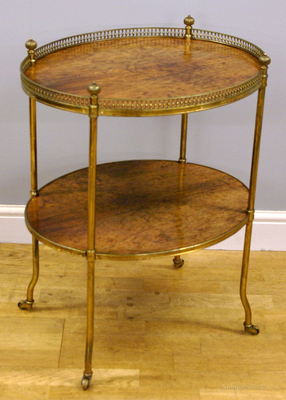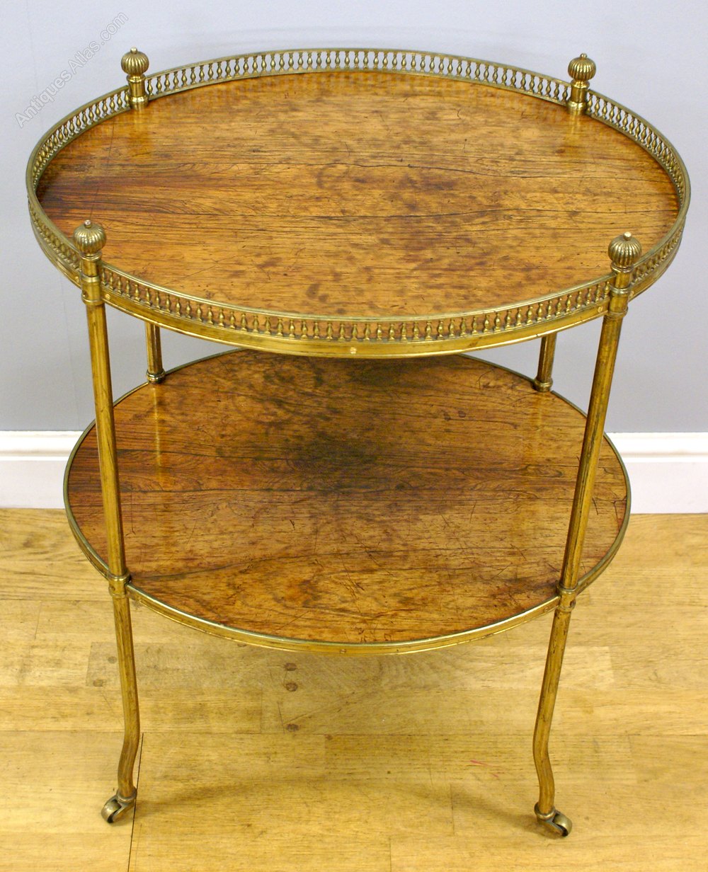 Of superior quality, standing on castors and with kick out, the lower tier with brass molded edge and the upper tier with a baluster gallery. The legs are topped with reeded finials. In very good and original condition, with the rosewood being a very good colour and patina.