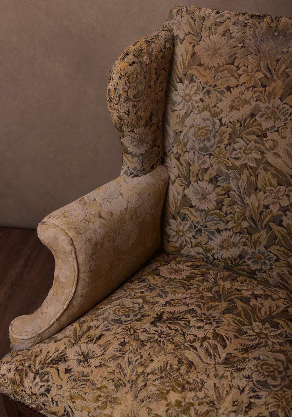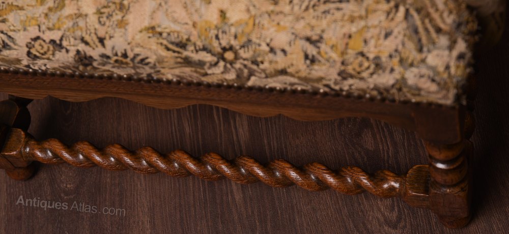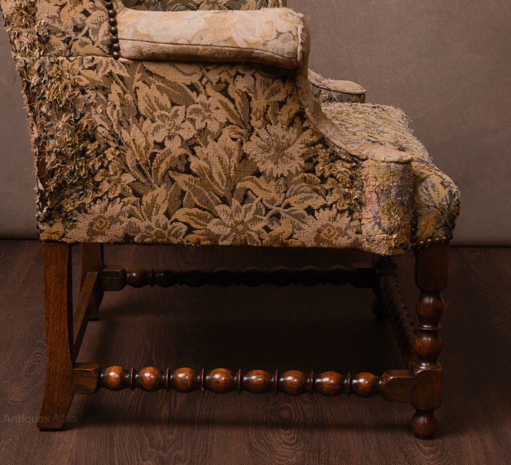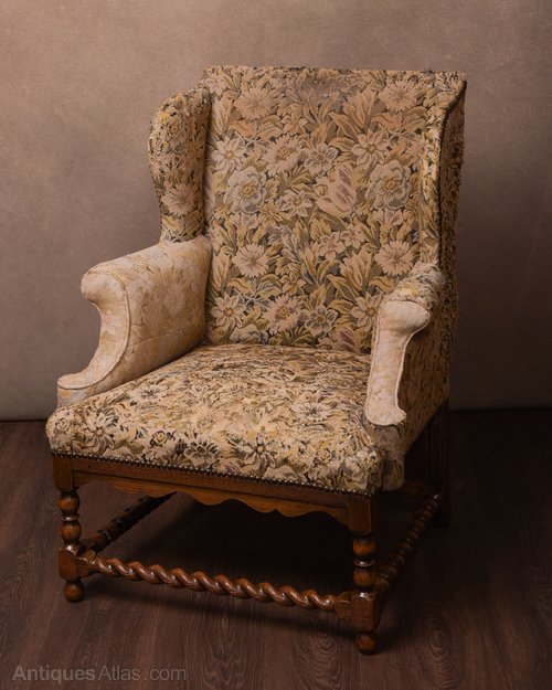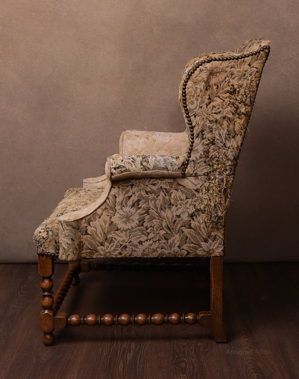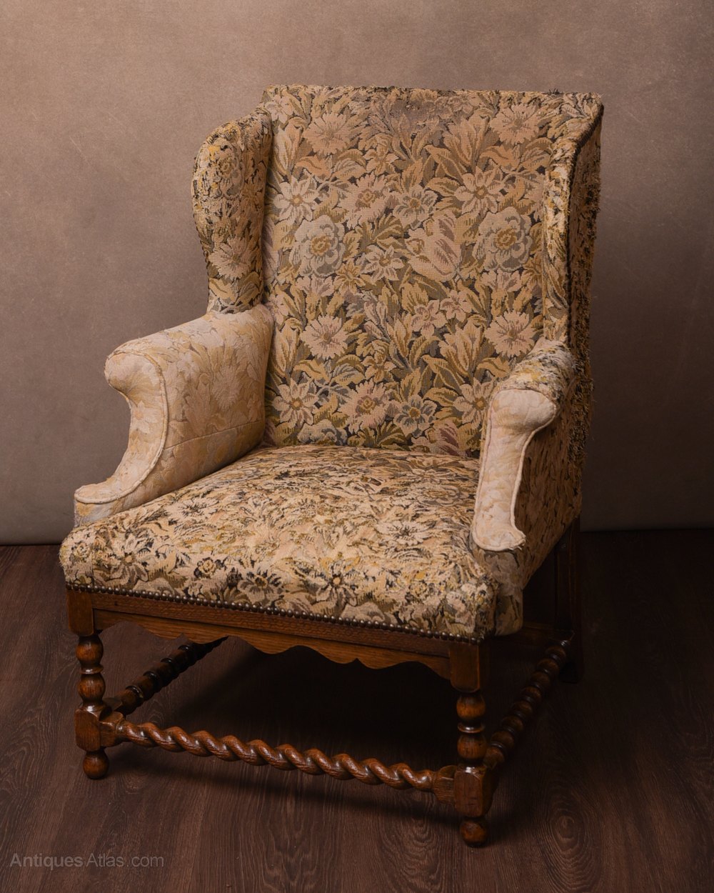 An Upholstered Oak Barley Twist Wing Arm Chair