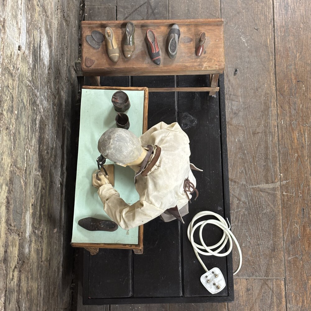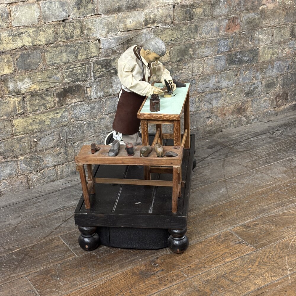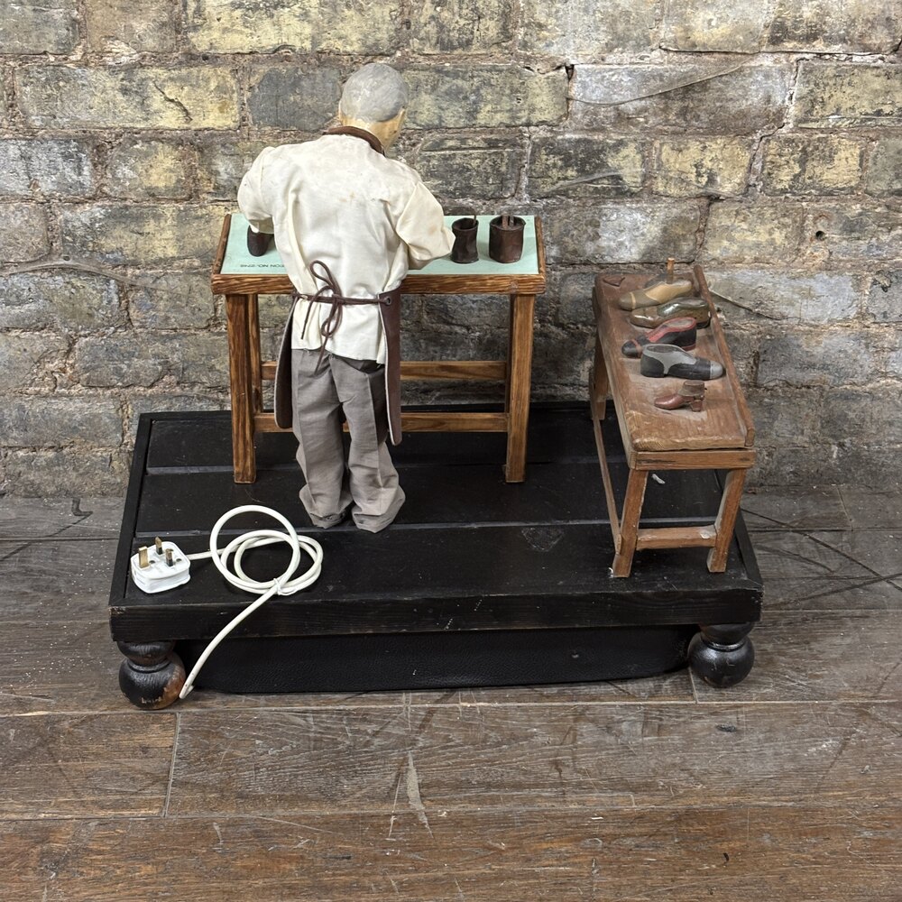 This wonderfully detailed automaton features a shoemaker at work, likely dating from the 1930s, and would have originally been used as a shop window display or trade promotion piece. Constructed with hand-carved and painted elements, fabric clothing, and mounted on a black-painted wooden plinth, the figure is mechanically animated via an electric motor concealed in the base.
